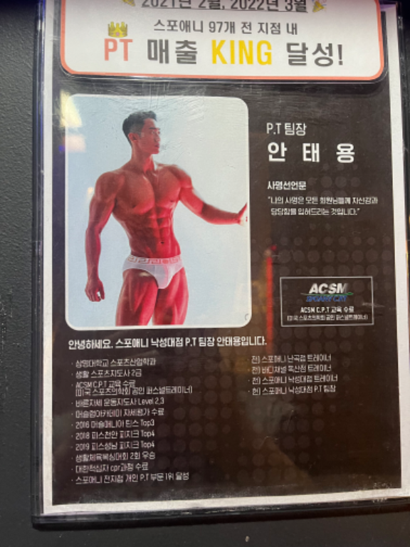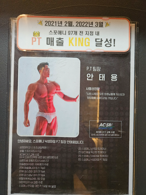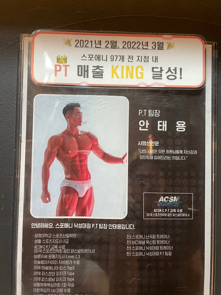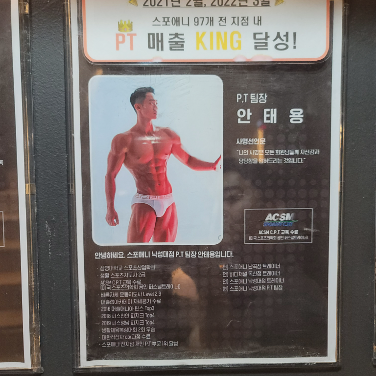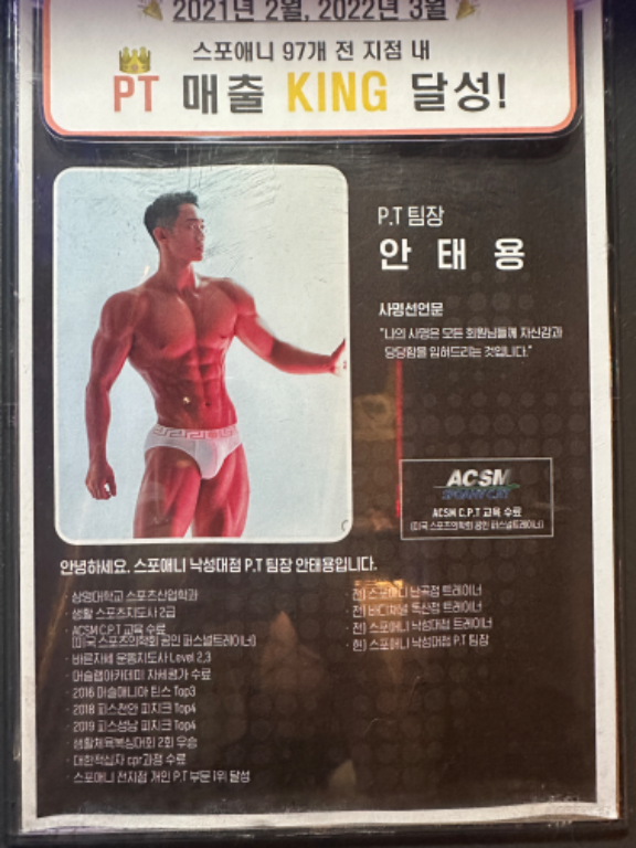 나만 알려고 안쓰려고 했는데 나만 알기 아까워서 씁니다..... 20대 초반에 삼년을 웨이트 했고 6년 휴지기를 가지다가 근 6kg를 쪄서 이대론 안되겠다 싶어 다시 찾아간 낙성대 스포애니. 이력서 경력이 많아 지저분한 쌤으로 고르자 가 내 취지였는데 딱 안태용이 적합했고, 그 찐 살을 다빼주겠다고 자부했음. 함만 끊어보자 하고 피티 시작했는데 지금 1년째 + 거의 70회.. 식단 간섭 받고싶으시면 태용쌤 믿어도 되고, 운동한거 돈 안아깝다 느끼고싶으신 분들도 무조건 추천.. 제가 그렇게 다시 6키로 빼서 6개월 넘게 유지중. 나 한번만 하고 더 안끊으려했는데 내 몸이 변하는 걸 보니 안태용은 마약이다 싶음. 지금 48키로 유지중. 아 중간중간 식단 습관은 필수입니다. 그리고 수요일 7시도 제꺼이니 칸부족