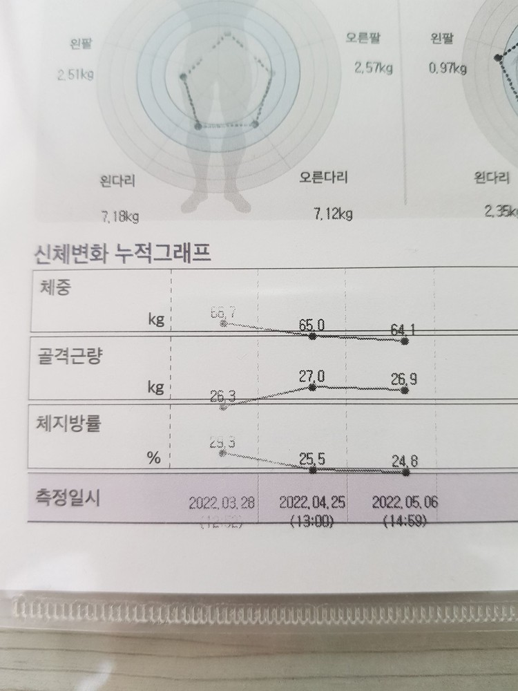 처음 시작할 때 몸무게 66.7kg지만, 안태용 트레이너님과의 PT를 막 졸업한 현재는 61kg로 근육량을 지켜내면서 5kg 이상을 감량할 수 있었습니다.