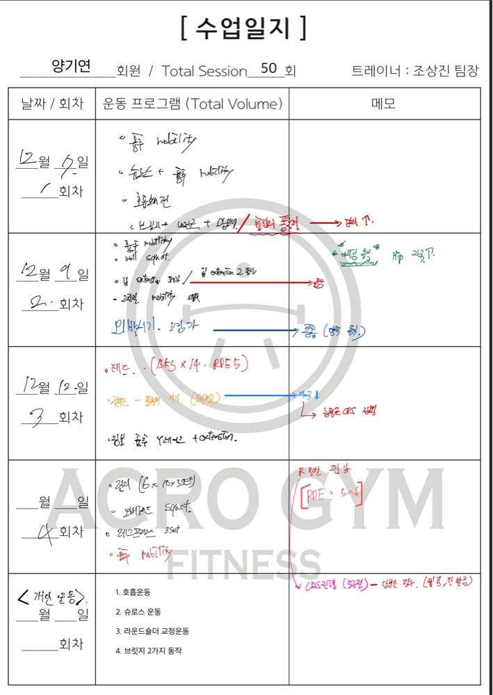 매 수업마다 기록해주셔서 개인 운동 할 때 어떤 운동할지 고민 안하고 운동일지 보면서 했습니다 :)