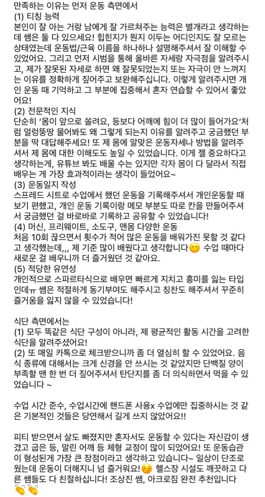 - 저는 허리가 좋지 않고, 고관절에도 통증이 있었는데, 항상 그 부분을 신경 써서 운동 전에 미리 풀어주시고 운동 자세를 할 때도 허리가 다치지 않게 세심하게 신경을 써주세요! 그래서 전에는 다리가 저려 하지 못했던 운동도 선생님께서 자세를 교정해주신 후 다리 저림 없이 할 수 있게 되었어요!