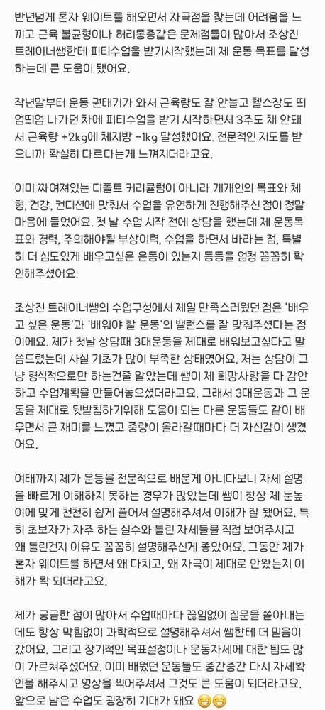 특히 궁금한 것이 많아 이것저것 여쭤보는데 조상진 트레이너님은 단 한 번의 막힘없이 원리와 방법을 설명해 주셔서 언제나 만족하고 있습니다.