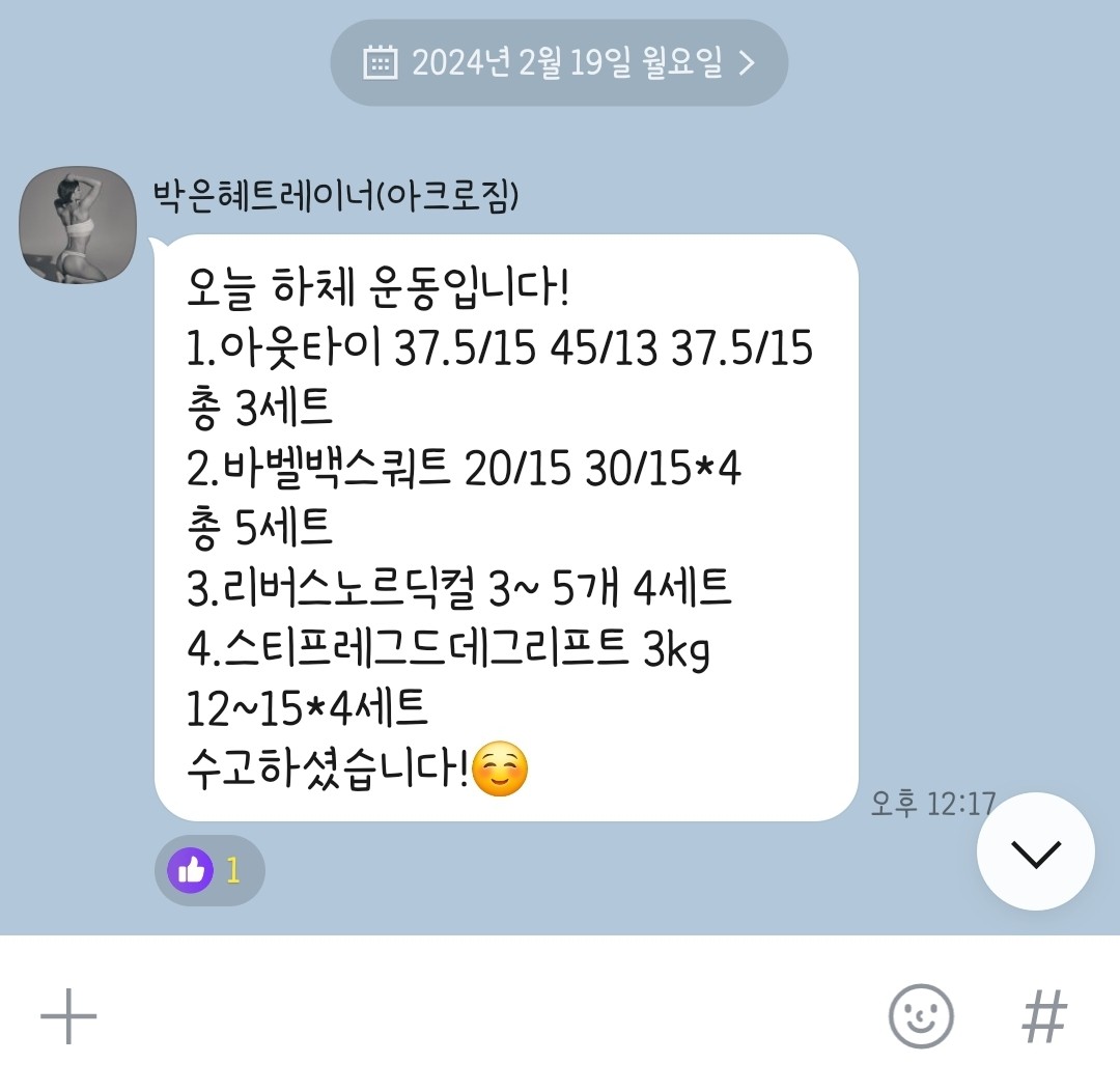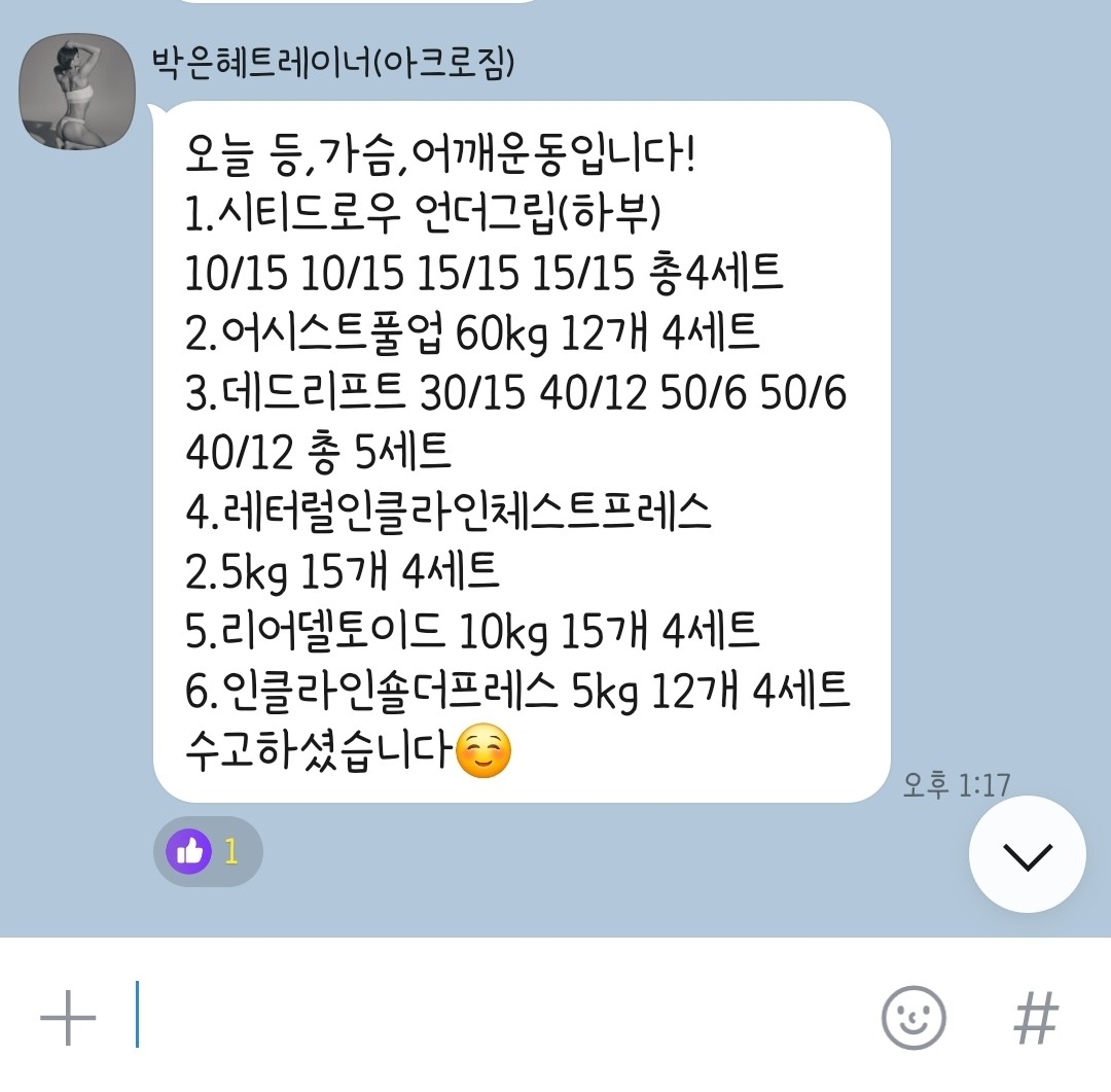 혼자 운동 하다가 박은혜 선생님에게 데드와 스쿼트 벤치등을 배웠는데 자극점을 잘 짚어주시고 운동한 기분이 들어요! 친절하시고 이해가 가게 설명 잘 해주십니다^^ 끝난뒤엔 꼭 뭐했는지 정리해주고 어떤 방향성으로 운동하면 좋을지 말씀해주시는데 개인운동할때 아주 도움이 많이 됍니다! 은혜쌤강추👍
