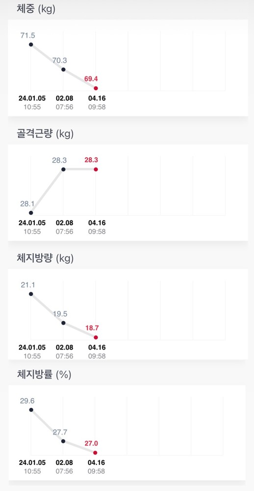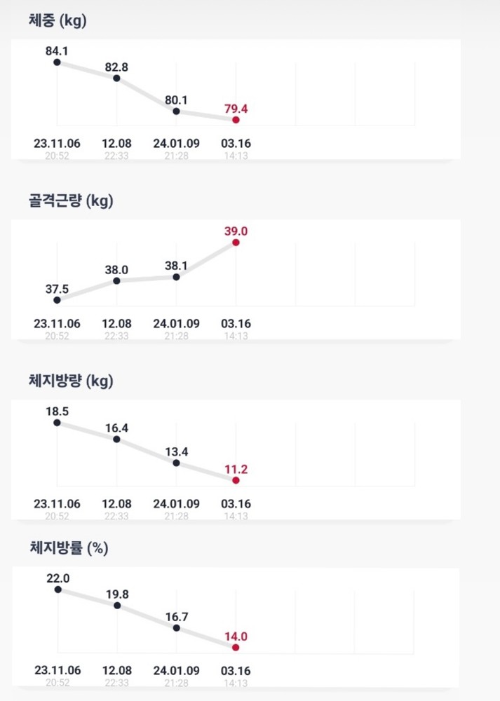 코치님과 운동하는 시간이 계속해서 기다려집니다. 3개월 정도 코치님과 함께 했는데, 가장 달라진 부분은 운동에 대한 태도에요! 옛날에는 그렇게 싫었던 운동이, 요즘에는 삶의 활력소가 되어 가고 있어요. 다 코치님 덕분입니다! 무게도 쑥쑥, 인바디도 으라차 ~