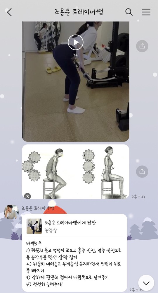 그날 배운 운동 수업 후 카톡으로 정리해서 보내주시는데 복습하며 많은 도움이 됩니다.