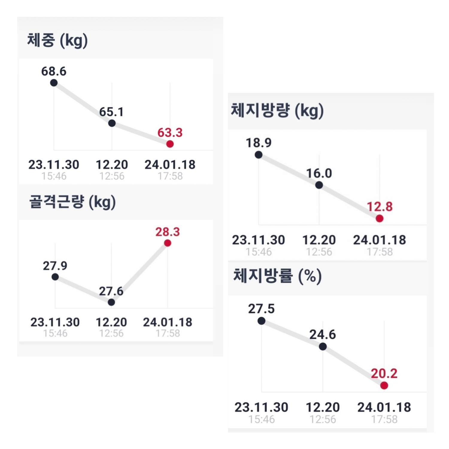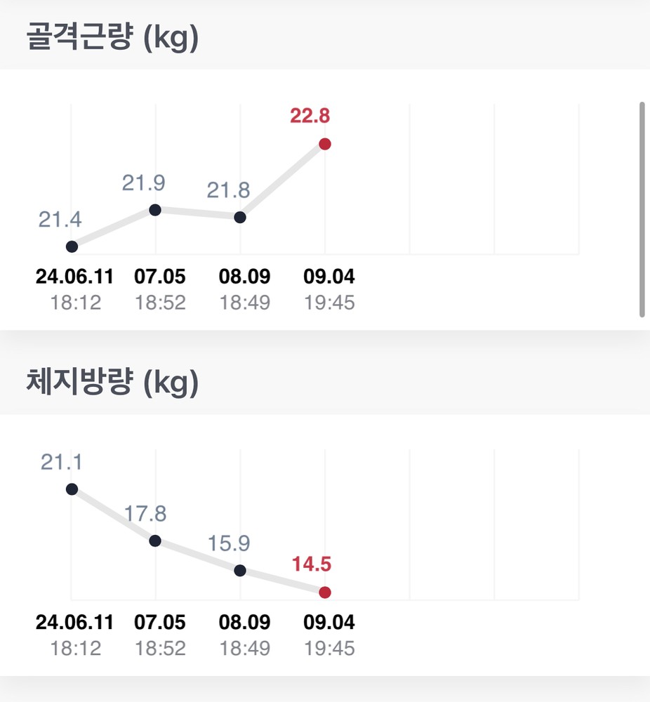 결과적으로, 3개월에 근육량 1.4키로, 체지방률 9%감량했습니다! 💪🏻
