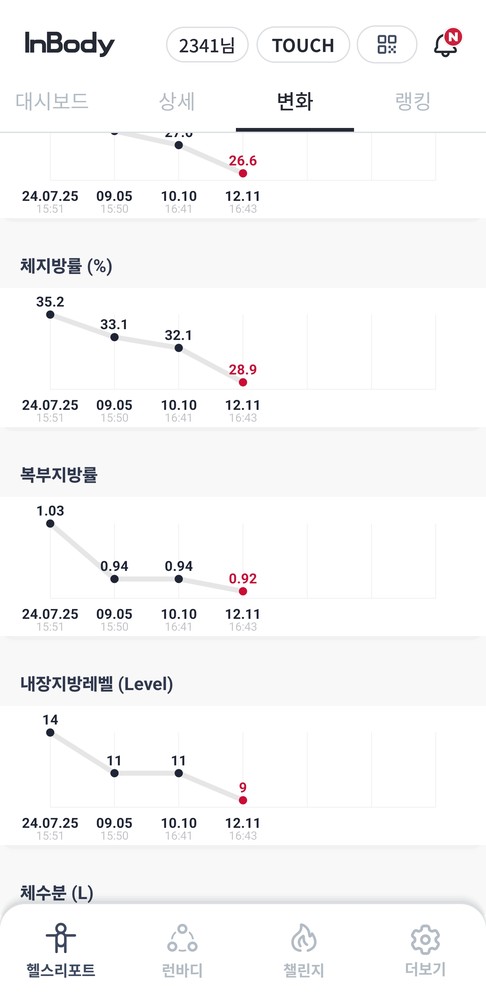 와이프에게 이끌려 PT를 등록한지 어느덧 4달이 흘렀는데 저도 모르는 사이에 인바디와 눈바디가 몰라보게 좋아졌습니다!ㅋㅋㅋ 중력 거스르는걸 극도로 싫어하는 1인이었는데 용운샘덕에 중력 거스르는걸 좋아하게 되었습니다. TMI지만 뱃살이 들어가니깐 양말신거나 발톱 깎을때 너무 편안합니다ㅋㅋ 앞으로 10회 반복 기준으로 3대 300 찍는날까지 잘부탁드립니다~~