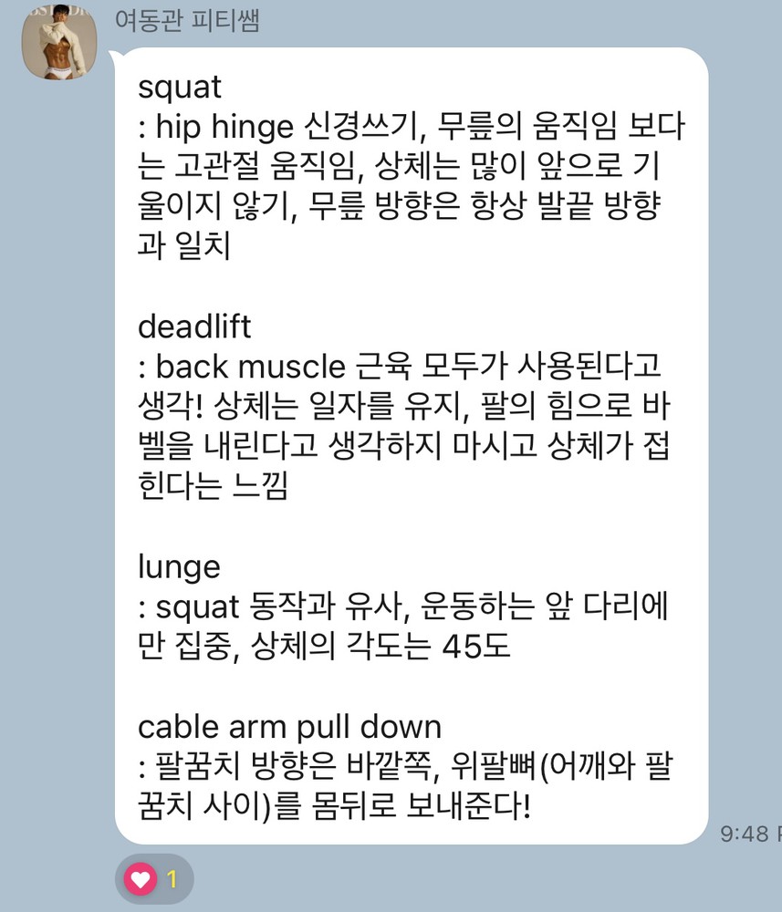제가 근력운동 기본기가 약해서 스쿼트랑 데드리프트 열심히 배웠는데 이제는 운동을 이해하고 혼자서도 개인 운동을 잘 할 수 있게 되었습니다ㅎㅎ 감사해요 선생님!!