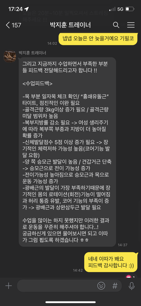 그래도 지훈쌤이 운동부터 식습관, 생활습관까지 자세하게 신경써주셔서 너무 좋았습니다!