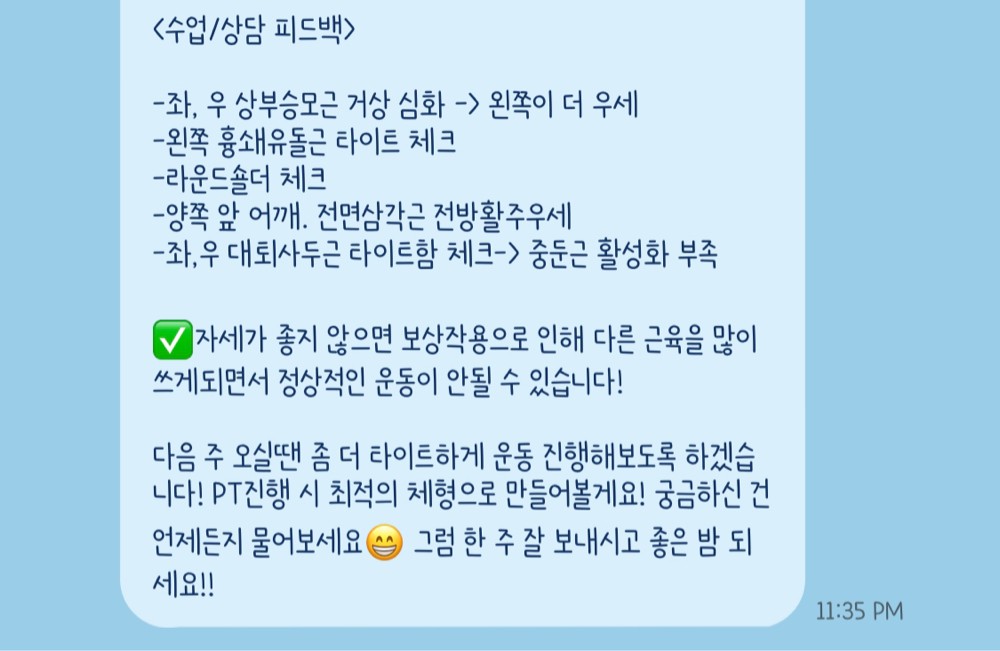 운동을 오랫동안 해왔지만 피티를 받아본건 이번이 처음인데 정말 받길잘했다고 생각했습니다