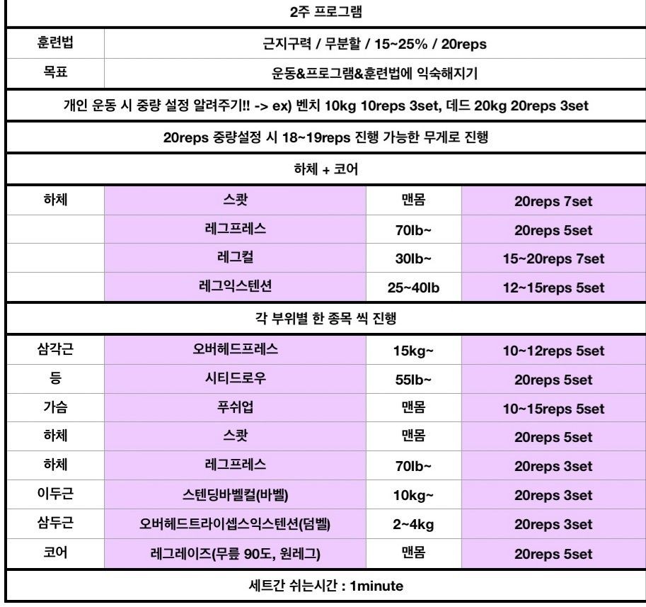 추가적으로 첨부된 이미지와 같이 PT수업이 없는 날에도 운동을 진행할 수 있도록 운동 계획표를 공유해주다는 점입니다.