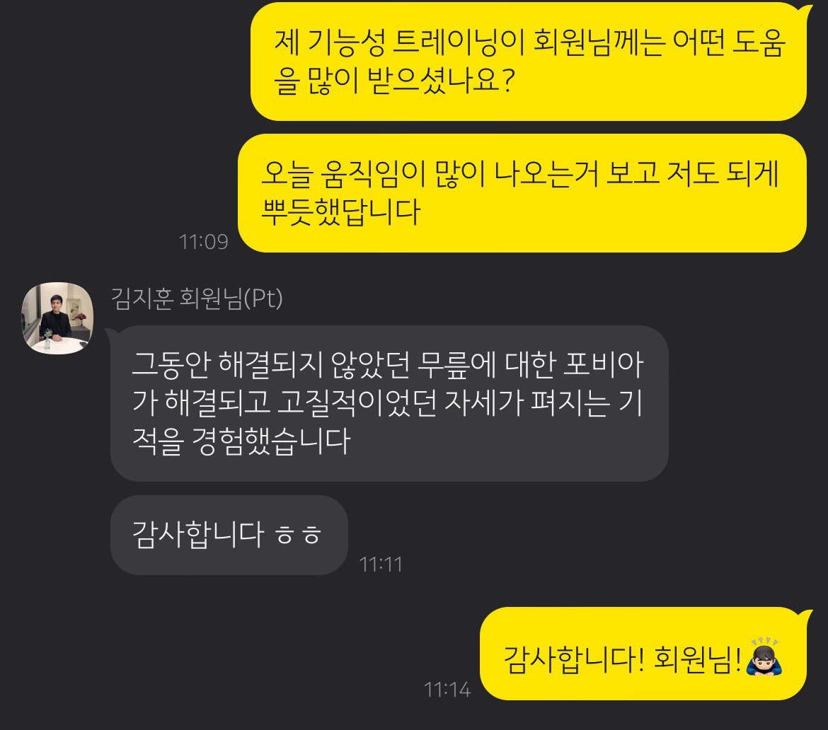 처음 선생님을 만나고 기능성 트레이닝이라는 것을 접한후에 그동안 공포의 대상이었던 하체운동을 할수 있게 되었습니다! (제가 어렸을때 무릎이랑 발목을 다친적이 있어 그동안 하체근력운동을 못했거든요)