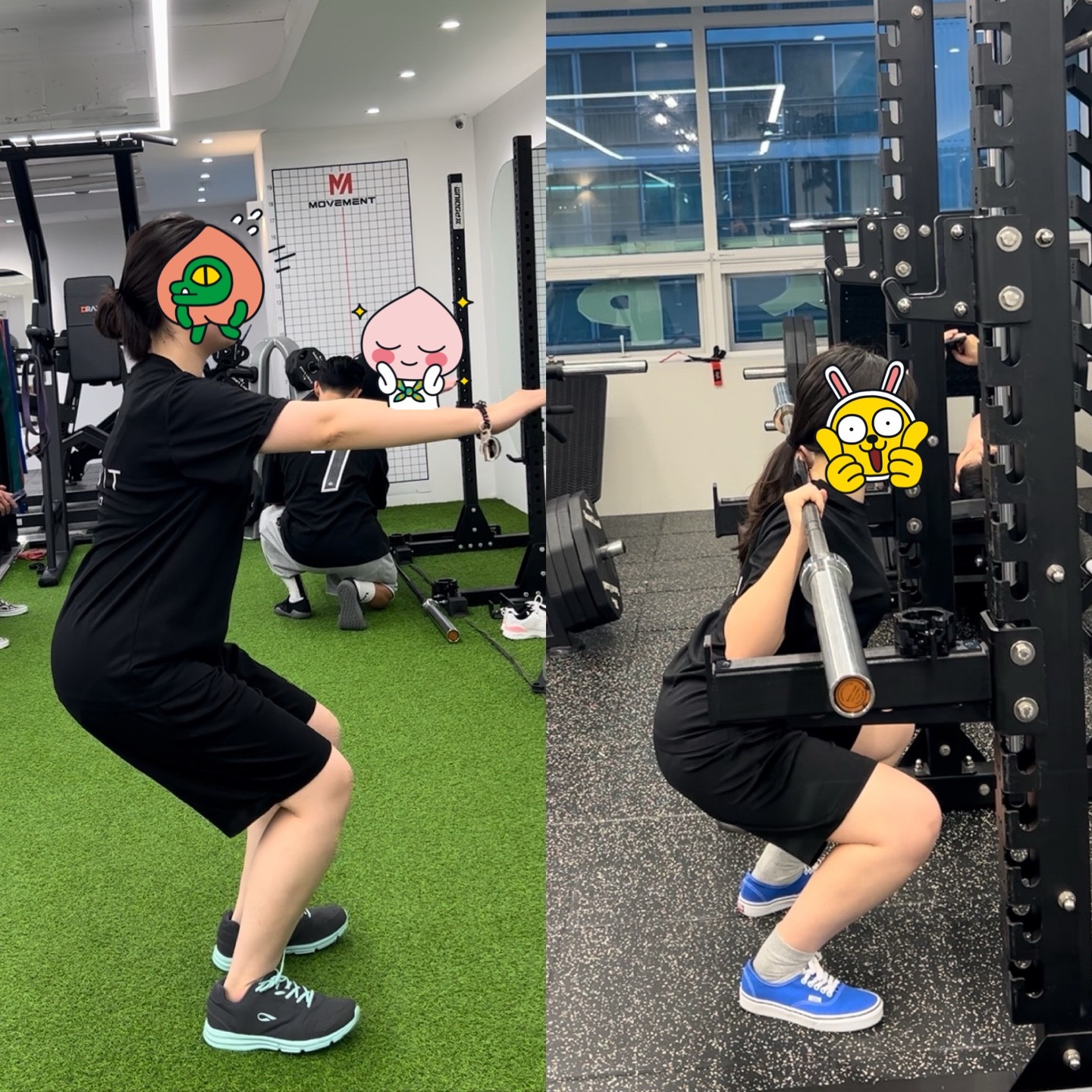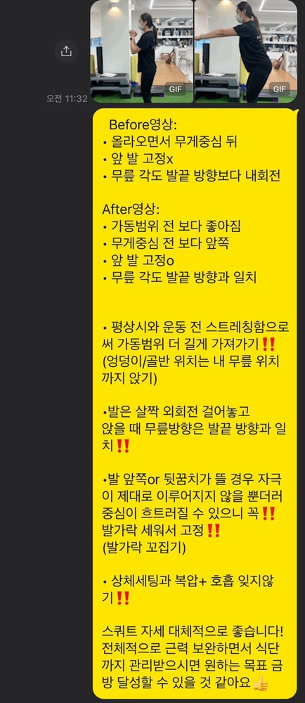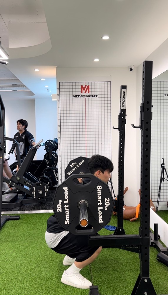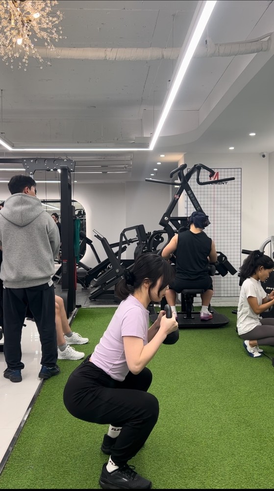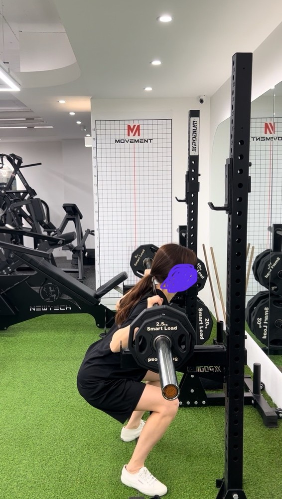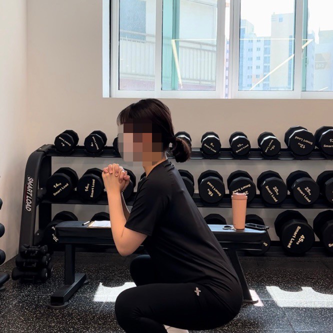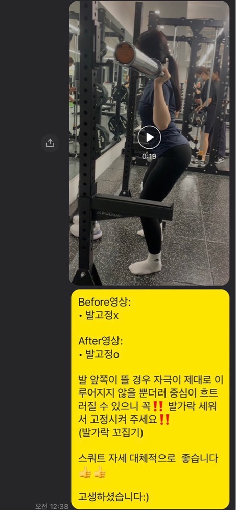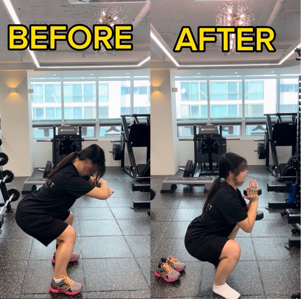 처음 스쿼트할 때는, 자세도 못 잡고 10개도 힘들었는데 신경 써야 하는 부분을 세심하게 봐주셔서 이젠 20kg 바를 들고! 1세트 당 20개를 할 수 있을 정도로 많이 발전했습니다!