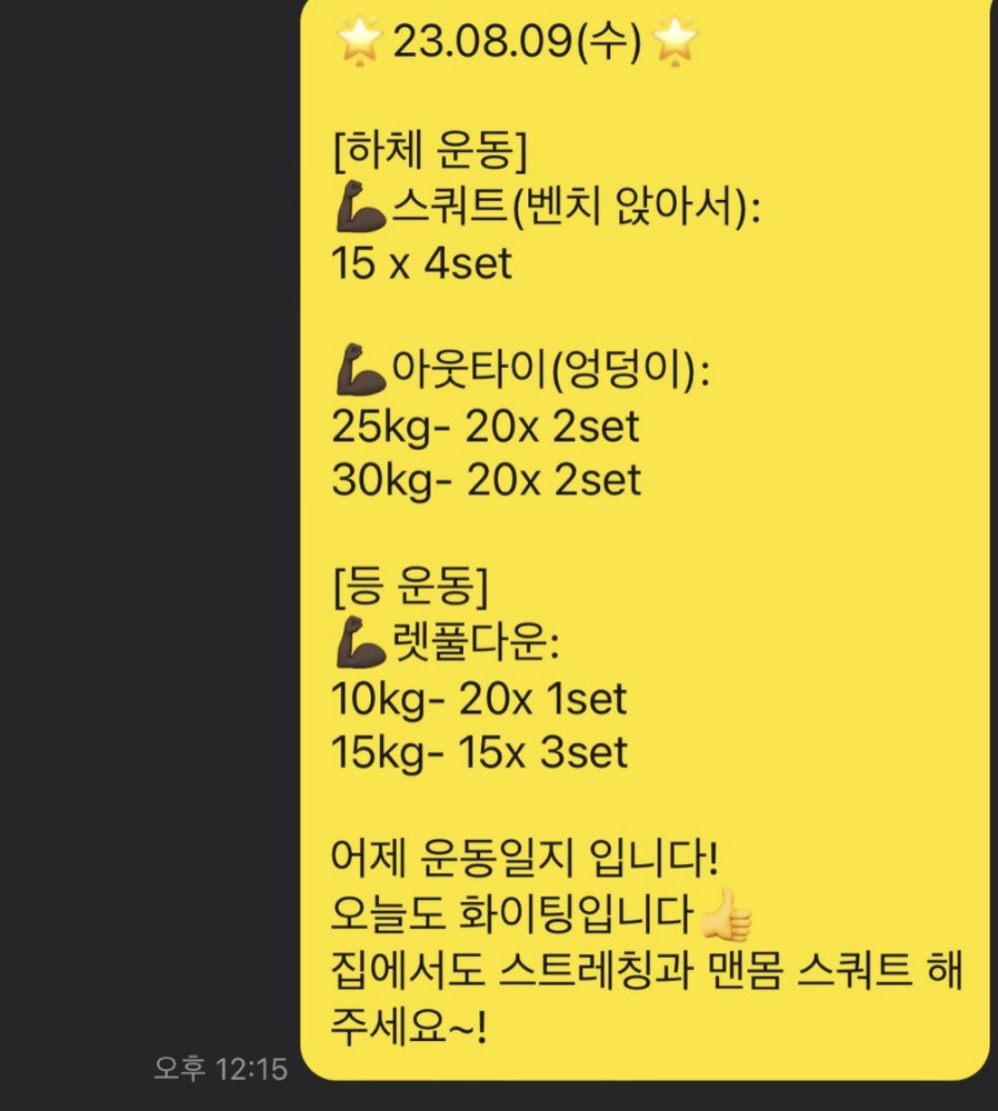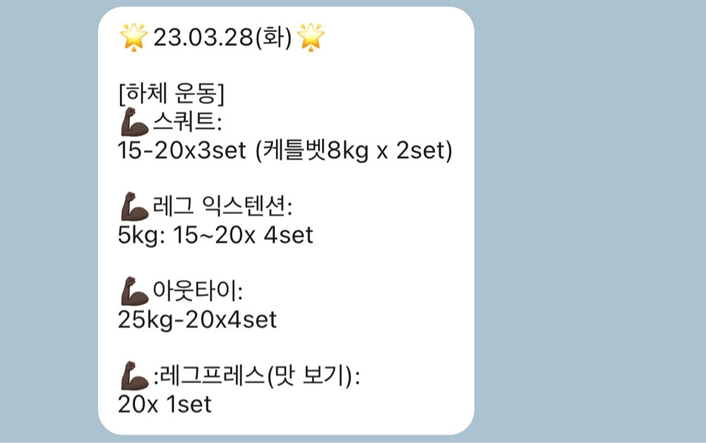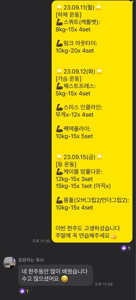 지금까지 다치지 않고 즐겁게 운동하셔서 정말 다행입니다. 중간에 회사 일 때문에 못 나오셔서 운동 흥미가 떨어졌을까봐 걱정이었는데 오히려 운동 못 나오시는 날에도 스스로 홈트영상을 보면서 운동하시려는 모습 보기 좋았습니다. 알려드린 자세 잊지 마시고 지금처럼 꾸준히 해주