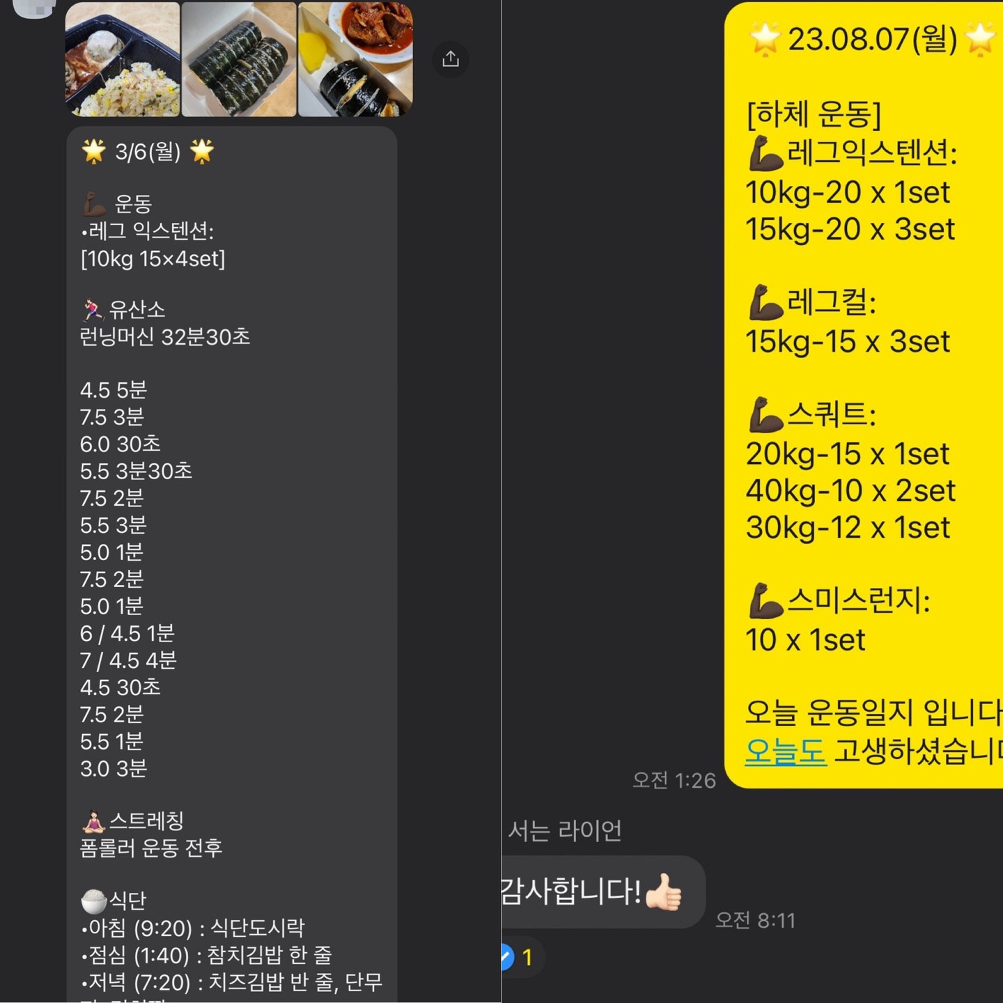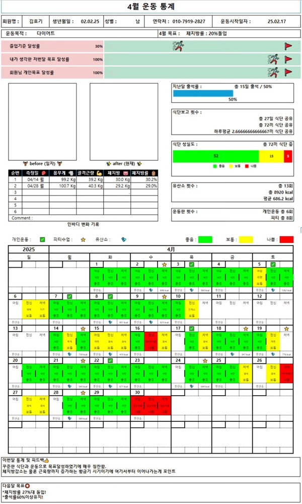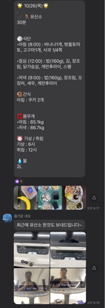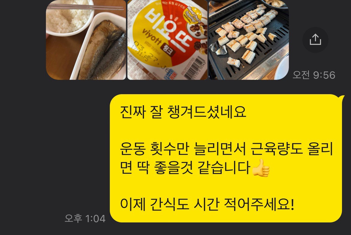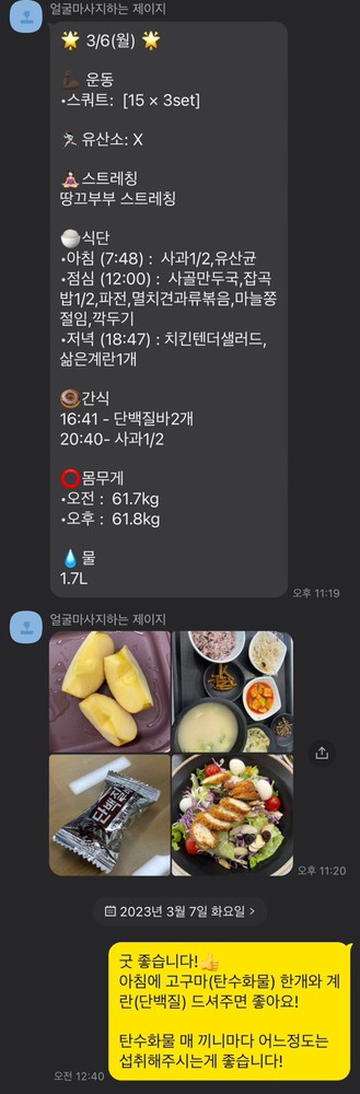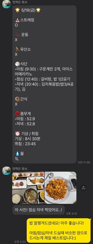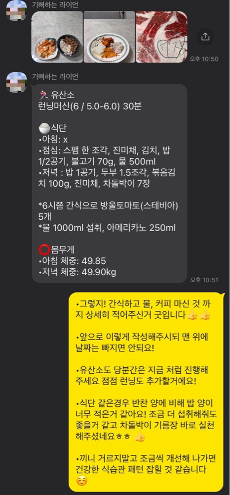 매일 카톡으로 식단,운동,기상시간 등을 보고드리면서 철저하게 관리해 주십니다:) 덕분에 잘 유지하고 있어요