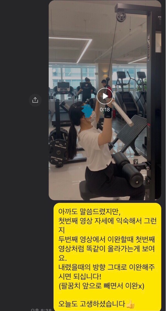 예리님 같은 경우에는 평상시 거북목과 라운드 숄더가 심해서 제대로 몸을 풀지 않고 운동하게 될 경우 무리가 올 수 있어요. 운동 전 뿐만 아니라 시간 나실 때 마다 틈틈이 몸을 풀어주세요! 바쁜 일정 속에서도 기분 좋게 운동 나오시려는 모습 너무 보기 좋습니다!👍👍