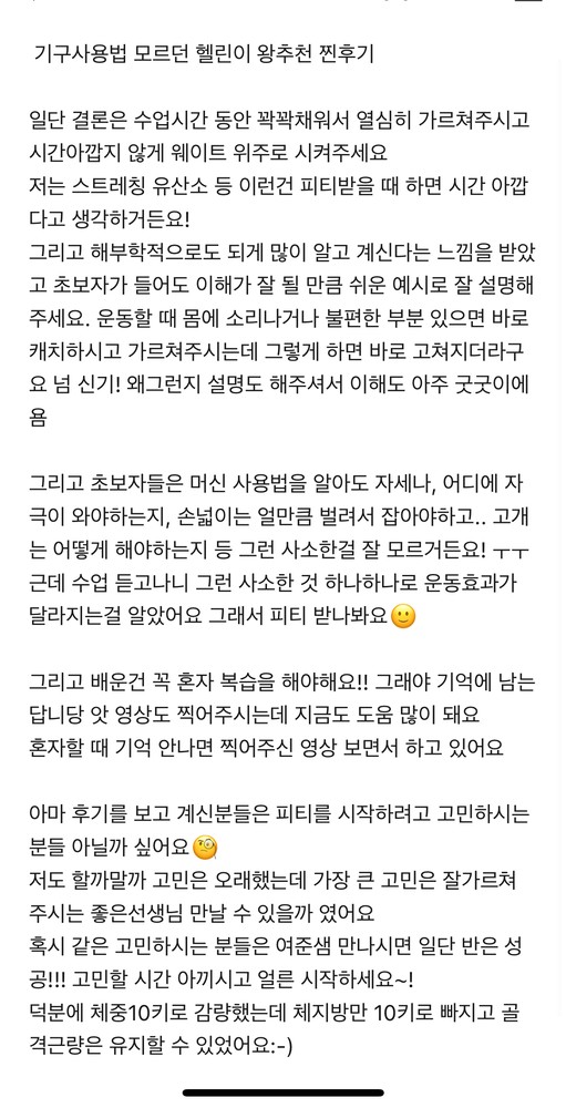 완전 헬린이라 운동에 대해 아무것도 몰랐는데, 선생님이 자세를 하나하나 잡아주시고 동작마다 어떤 부분을 신경 써야 하는지 계속 체크해주셔서 혼자 운동할 때도 도움이 많이 됐어요.