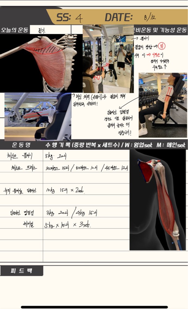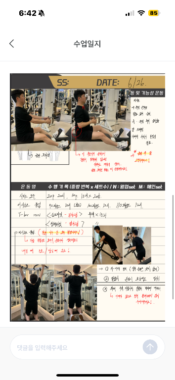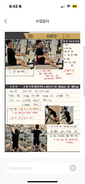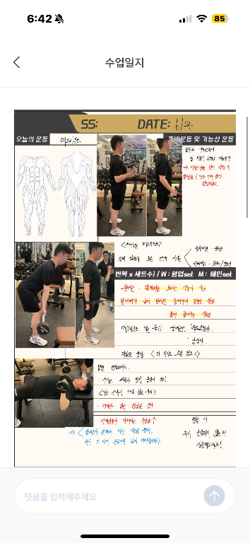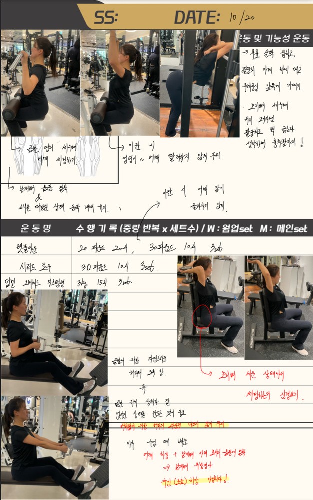 처음에는 필라테스를 위한 코어 운동을 많이 하게되었는데 점점 헬스의 비중이 늘어가고 수업일지를 너무 잘 써주셔서 저는 잘 몰랐지만 주변에서 정말 꼼꼼히 잘 써준다고 하더라구요~영상은 덤이구요 그래서 복습하기에도 편했어요