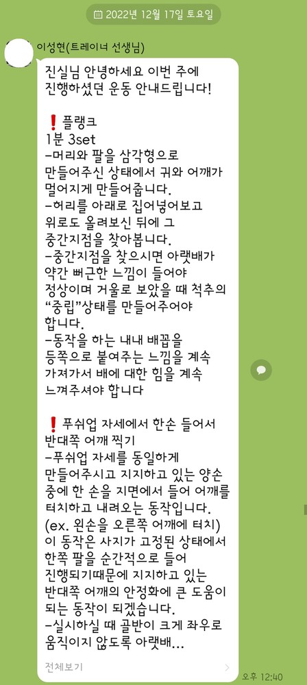 또, 운동 후 그 주에 했던 운동을 상세히 정리하여 보내주십니다! 저걸 보고 어찌 홈트를 안하겠어요!? 쌤의 정성에 감동받아 몸을 일으켜보게 됩니다🤸♀️ 항상 성실하고 친절히 가르쳐주셔서, 운동 다녀오면 기분이 좋네요😊 혹시 PT를 고민하고 계신 분은 꼭 한번 체험해보세요!