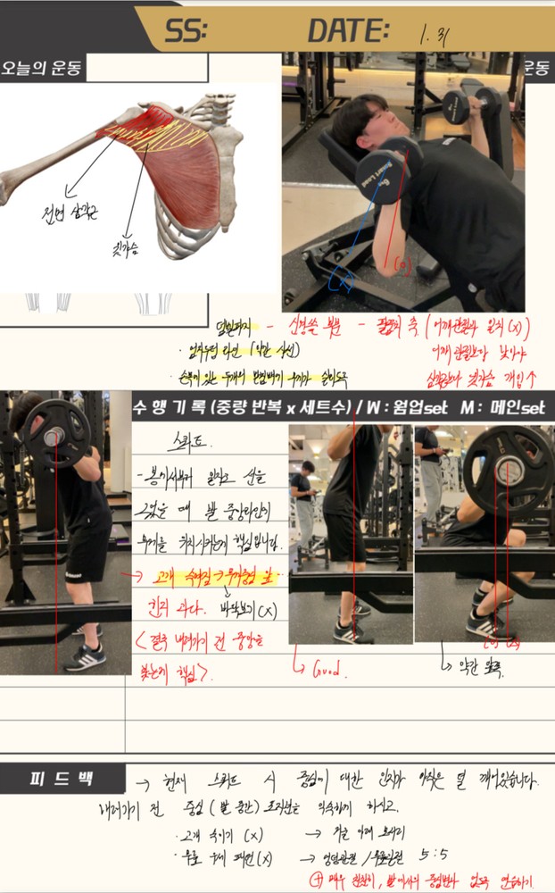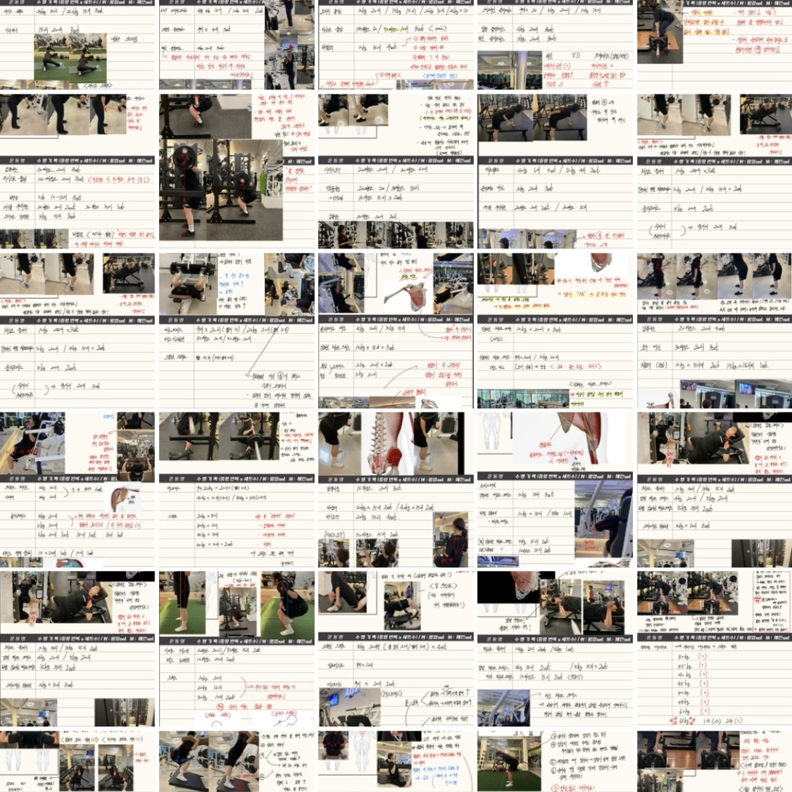 먼저 수업 후 매번 주시는 피드백 일지가 정말 세세한데, 동작을 직접 드로잉하며 견착 위치나 발 각도까지 세세하게 짚어주셔서 개인 운동 때 복습하기 최고입니다. 또한 해부학적 원리를 바탕으로 발바닥 접지나 하강 텐션 등을 쉽게 설명해 주시니 자극점 찾는 속도가 확실히 빨라졌습니다. 마지막으로 제 몸이 통제 가능한 범위를 정확히 설정해 주셔서, 중량을 늘려가면서도 부상 없이 안전하게 운동하고 있습니다.