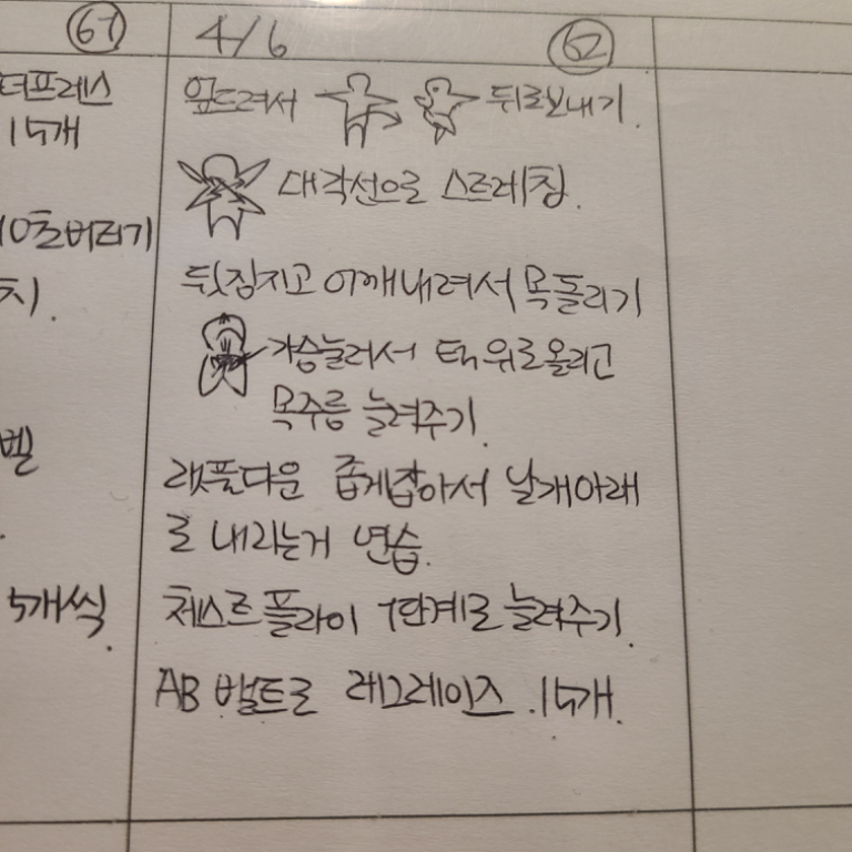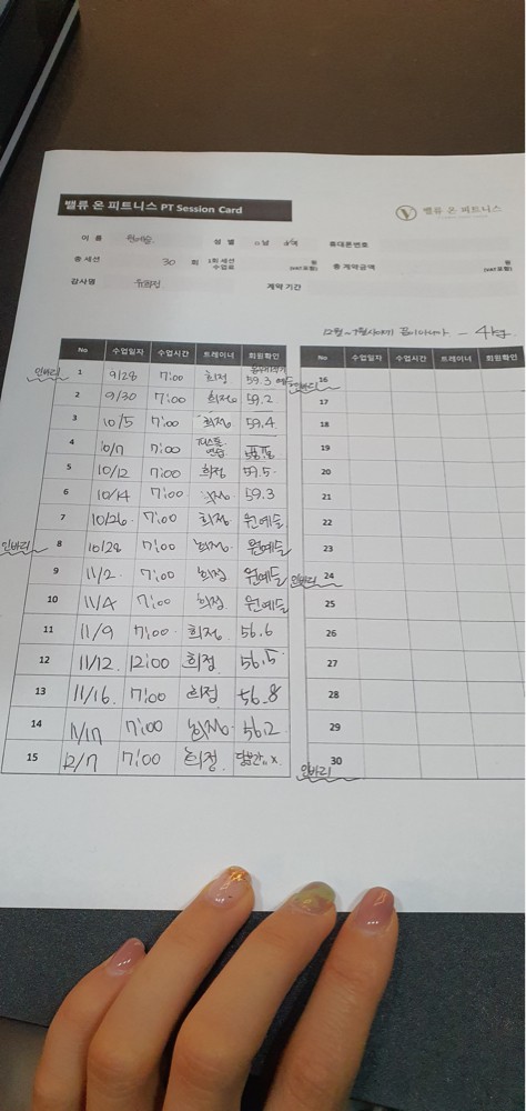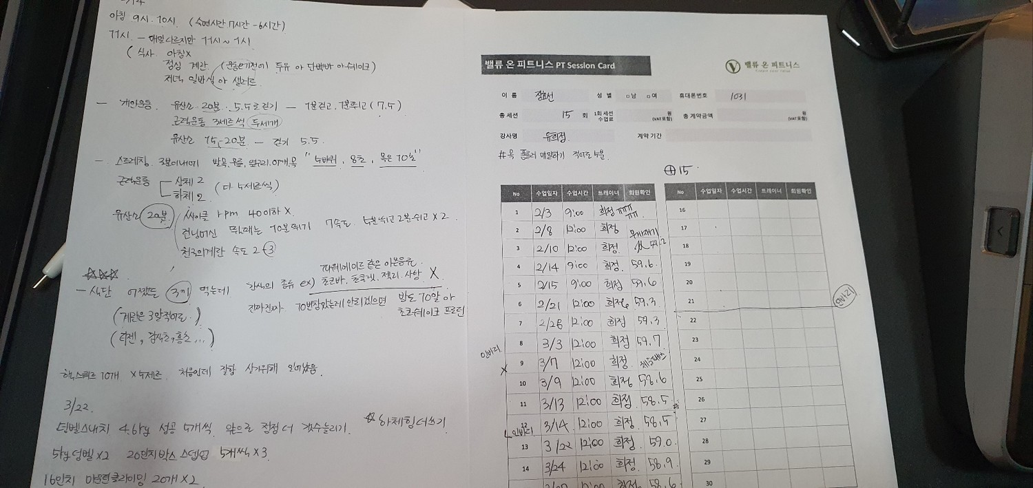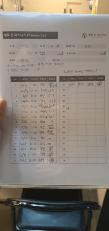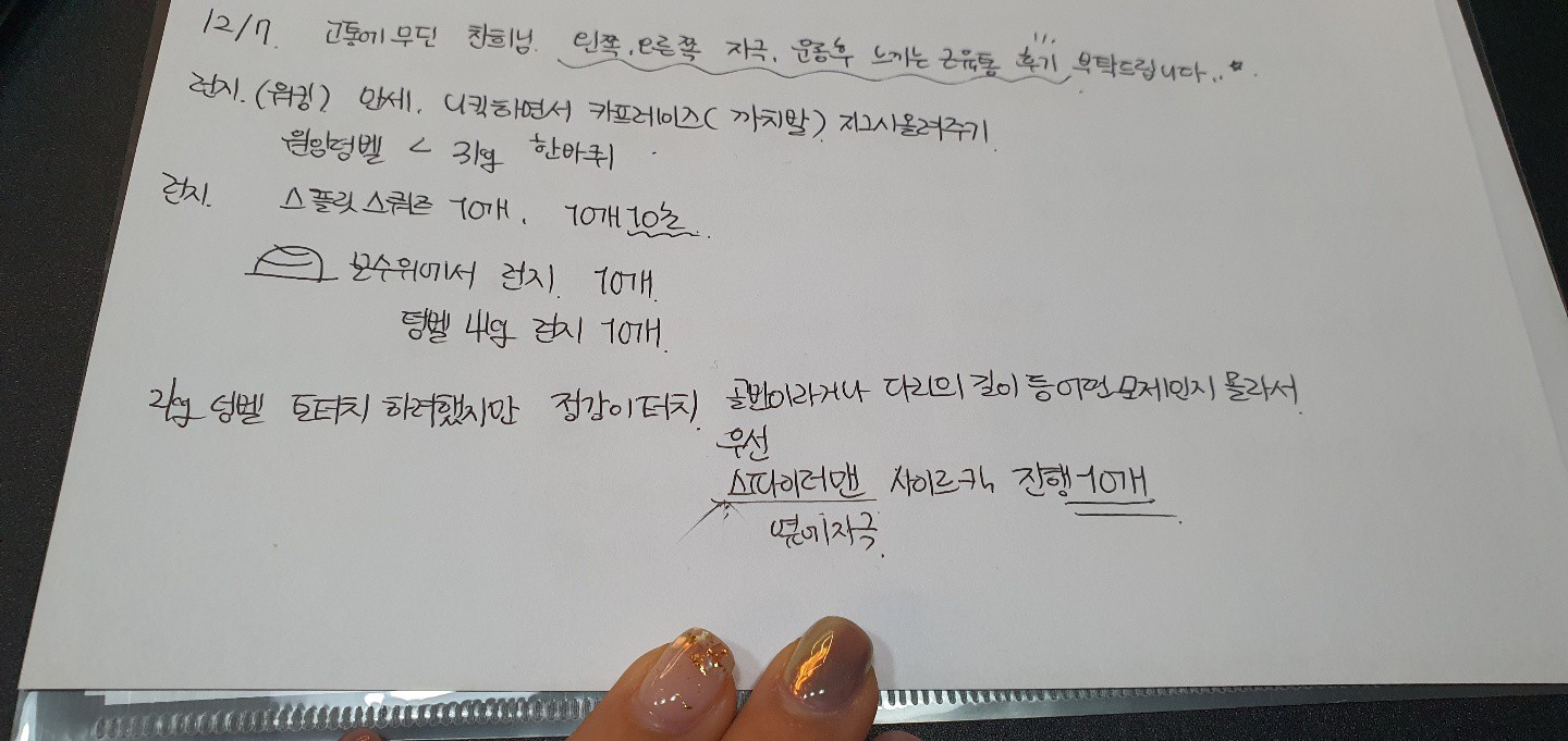 그리고, 특히! 수업끝나고 바로 운동일지를 꼼꼼하게 적어주셔서 개인운동할때도 걱정없이 운동할수있어서 잘 활용하고 있습니당:) 덕분에 개인운동도 잘다니고 있습니다 🥰