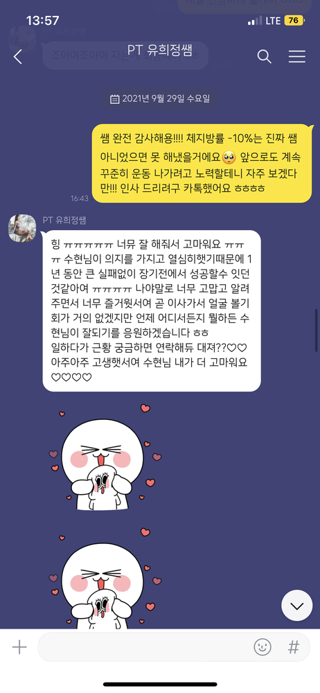 또 수업이 없는 날에도 몸상태, 식단 등등 확인해주시며 계속 소통하고 격려해주셔서 의지박약인 제가 열심히 하고싶다는 생각을 들게 해주셨어요..ㅎㅎ!! 남은 30회도 희정쌤께 믿고 맡깁니다🩷