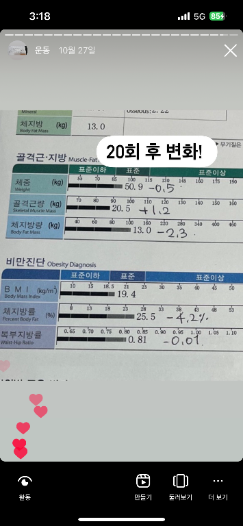 식단도 못하고 먹고픈거 외식 다하구 술도 막 마셧는데도 20회 후 변화가 정말 제 인생에서는 놀라운 변화였어요 !