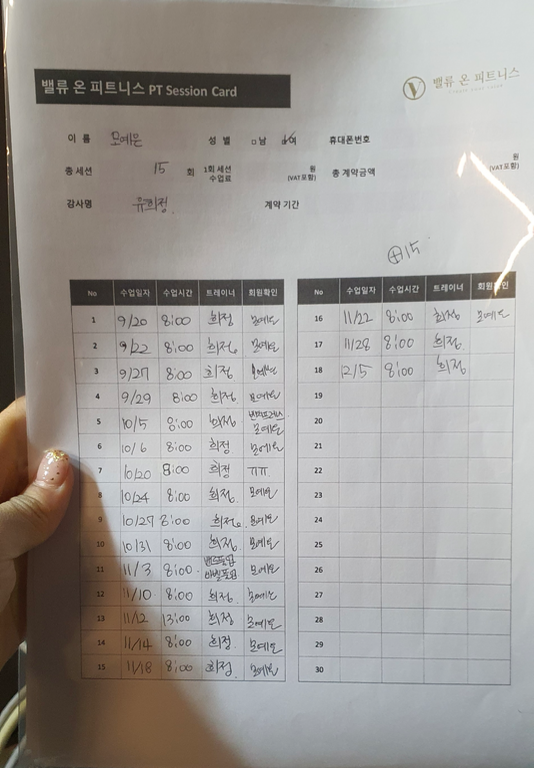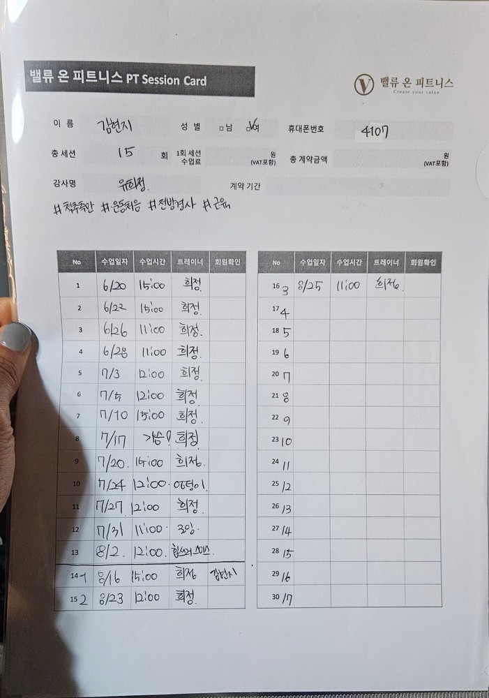 체력증진을 목표로 운동 시작했고 지금까지 15회정도 받았어요.