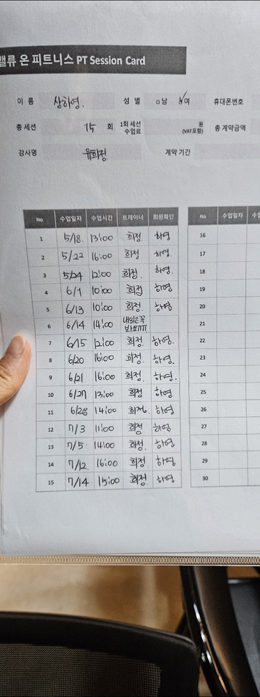 희정쌤과 15회 PT완료 후 후기 남깁니다😄 결론부터 말하자면 15회 종료후 PT 30회 추가했어요!! 너무 좋았던 점은 매번 수업 할 때마다 운동일지를 적어주시며 그 날 운동할 때 더 신경썼어야 할 부분, 중량, 세트 등 까먹기 쉬운 부분을 정리해주십니다! 저는 기구가 익숙하지않았는데 수업동안에도 상세하게 알려주시고 수업 끝나고도 리뷰할 수 있어서 좋았어요. 수업하고나면 홀라당 까먹기 쉬운데 볼 수 있으니까 개인운동시에도 좋더라구요!