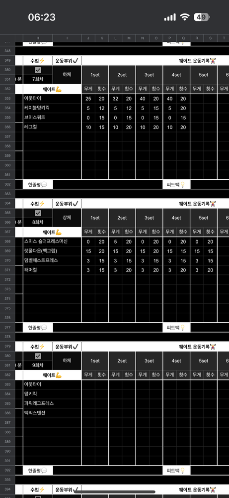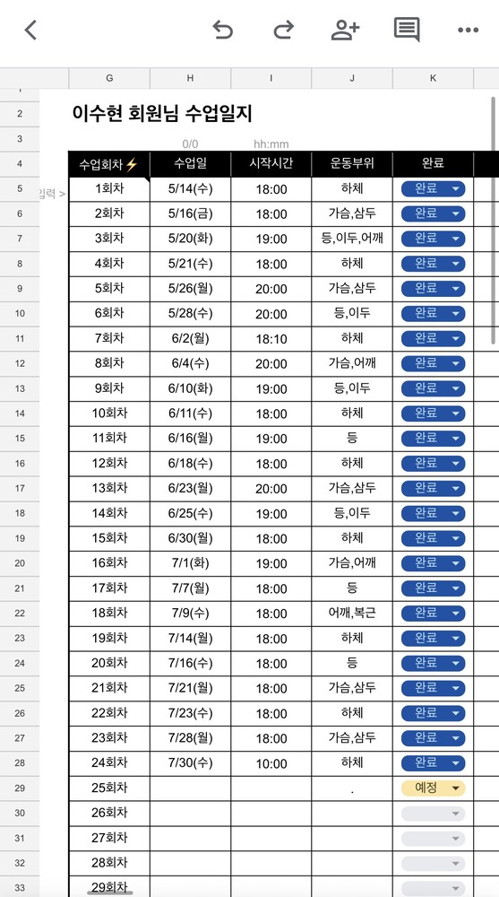 기구 사용법도 친절하게 알려주십니다. 헬스장에 있는 기구 전부 사용해보면서 제게 맞는 운동을 찾아 나갔습니다. 수업 내용도 구글 시트로 꼼꼼히 정리해서 매일 공유해주십니다. 헬스 입문하시는 분들께 더욱 추천드려요!