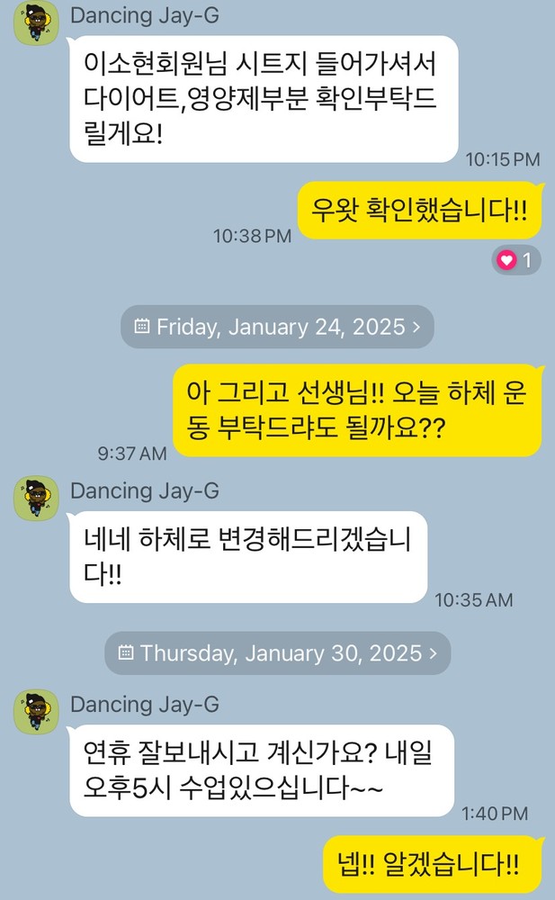 선생님께서는 운동 자세를 세심하게 교정해 주시고, 제 몸 상태와 체력에 맞춰 효과적인 루틴을 설계해 주셔서 매 수업이 힘은 들지만..ㅋㅋ 재미도 있고, 체력이 꽤 좋아진 것이 느껴집니다.