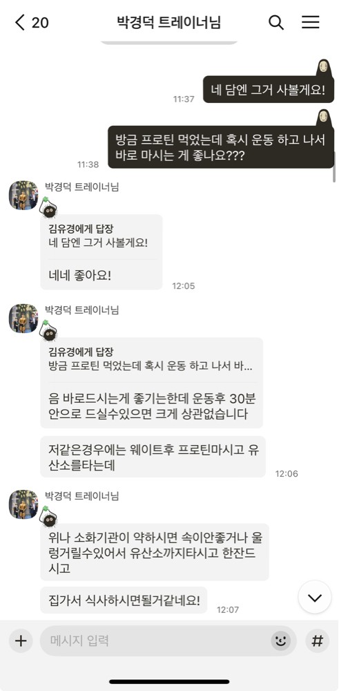 박경덕 코치님과 운동닥터앱을 통해 알게되어 지금까지 피티를 받고 있습니다. 처음에는 다이어트를 목적으로 했는데 저에게 맞춤형으로 진행해주셨습니다. 제 식단 루틴부터 다양한 식단도 제안해주셨어요. 체중감량보다는 근력향상쪽으로 가자하셔서 지금은 열심히 근력을 키우고 있습니다. 그리고 제가 매번 일정을 변경하는데도 불구하고 친절하게 해주셔서 너무 감사드립니다. 헬스를 처음 시작했을 때 체중감량을 해야지 생각 밖에 못했는데 지금은 저에게 어떤 것이 필요한지 알 수 있었습니다! 처음에는 반신반의하는 마음으로 시작했는데 후회 없는 피티 받고 있습니다!! 선생님 감사합니다!!