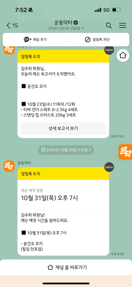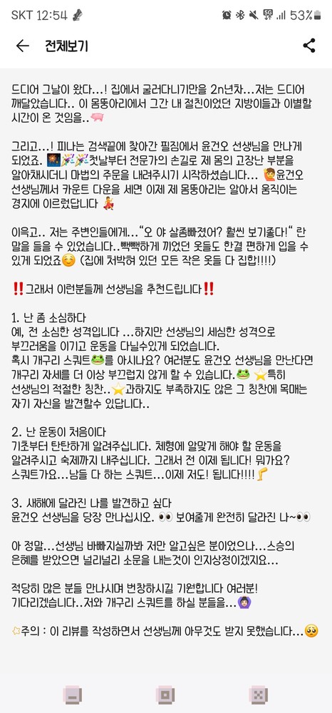 😊건오쌤은 제가 하는 질문에 당황하지 않고 잘 대답해주셔서 저의 내적 테스트를 통과하신 분입니다ㅋㅋ 그래서 바로 체험 피티 받고 1월부터 지금까지 하고 있어요!