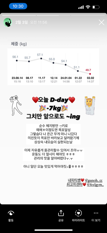 유산소도 놓치지 않고 운동 전후로 꼭 병행하도록 챙겨주셨고, 무엇보다 식단 !! 관리를 정말 잘해주십니다 !! 물 마시는 것까지 꼼꼼하게 챙겨주셔서 리얼 하마가 되진 못했지만 아기하마 정도 될 수 있었던 것 같아요 🦛 쌤과 운동을 시작하고 얼굴빛도 몸도 마음도 더 밝고 화사해졌어요 !!