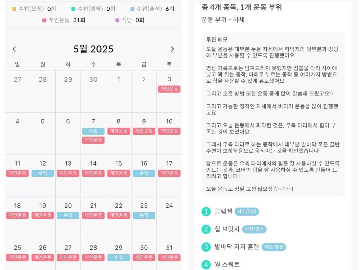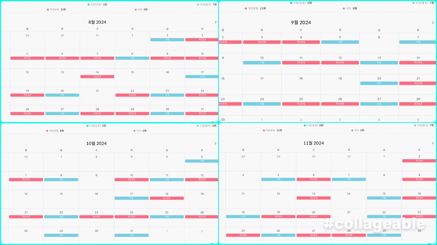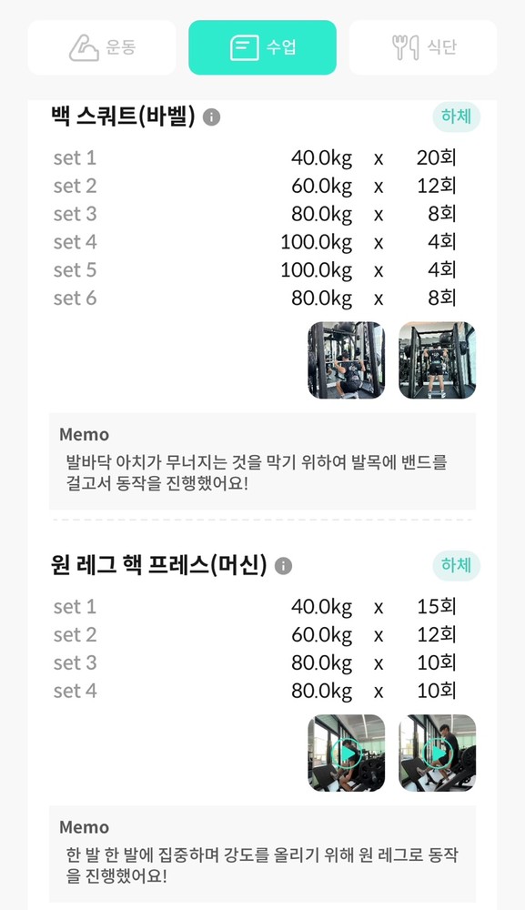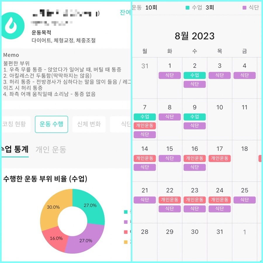 더군다나 자체개발한 어플에 제가 수업받은 내역, 모범자세, 제 자세를 찍어주신 영상이 모두 있어서 혼자 운동할 때 너무 도움이 됐습니다.