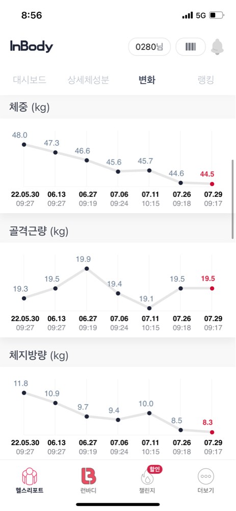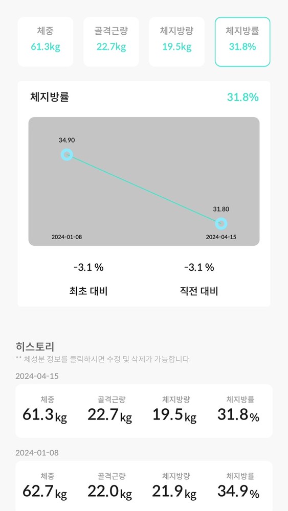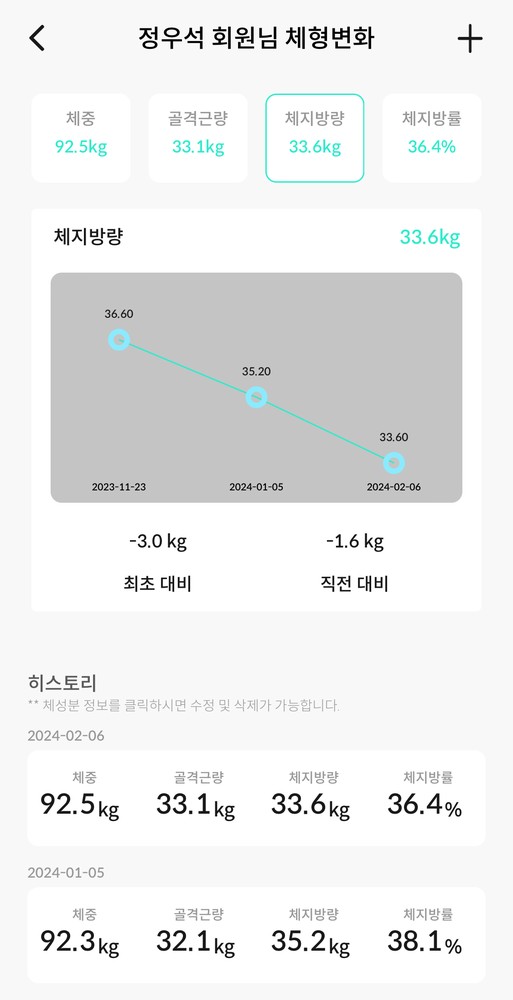 평소에 운동하는데도 왜 살도 안빠지고 무릎이 아플까 잘 몰랐는데 어플로 식단관리 받으면서 체지방량이 눈에 보이게 감소했어요!! 운동하면서 잘 안되는부분 영상으로 찍어주신것보고 개인운동도 쉽게 따라할수 있어서 좋았구요~~ 식단 너무 스트레스 받지 않으면서 체지방 감소되고 근육량 늘어난점이 너무 만족스럽습니다^^ 임재우 마스터 코치님 열심히 재미있게 잘 가르쳐주셔서 감사해요!! 위례에서 제일 깔끔하고 쾌적한 피티샵 아닐까 추천합니다♡♡♡