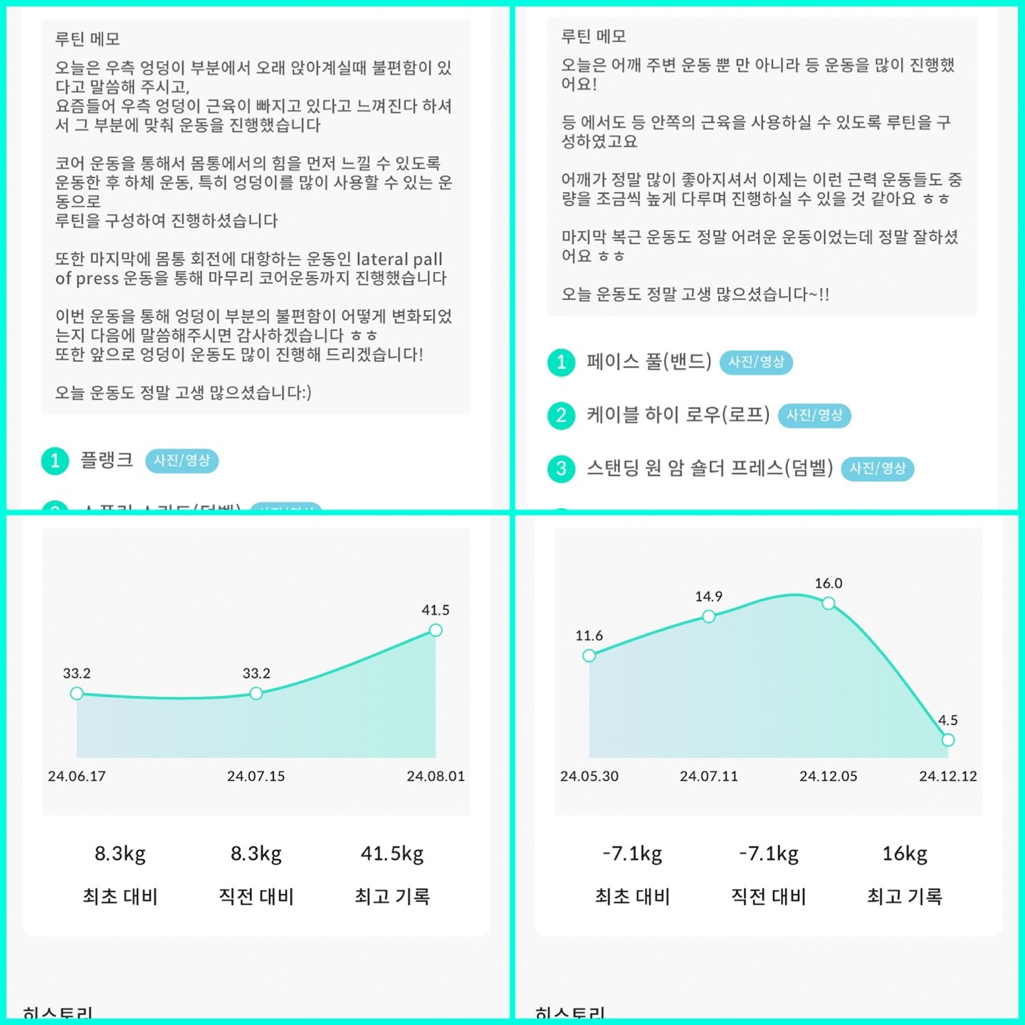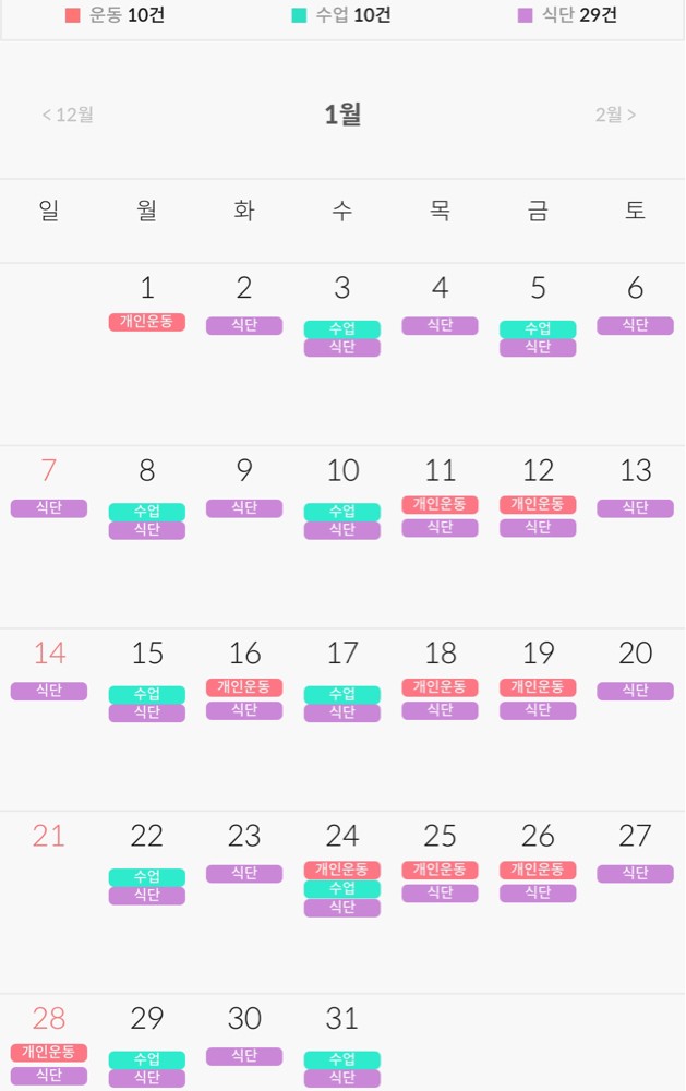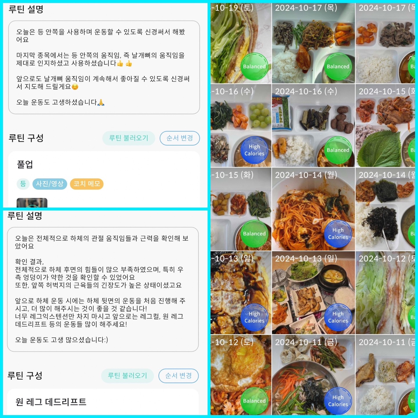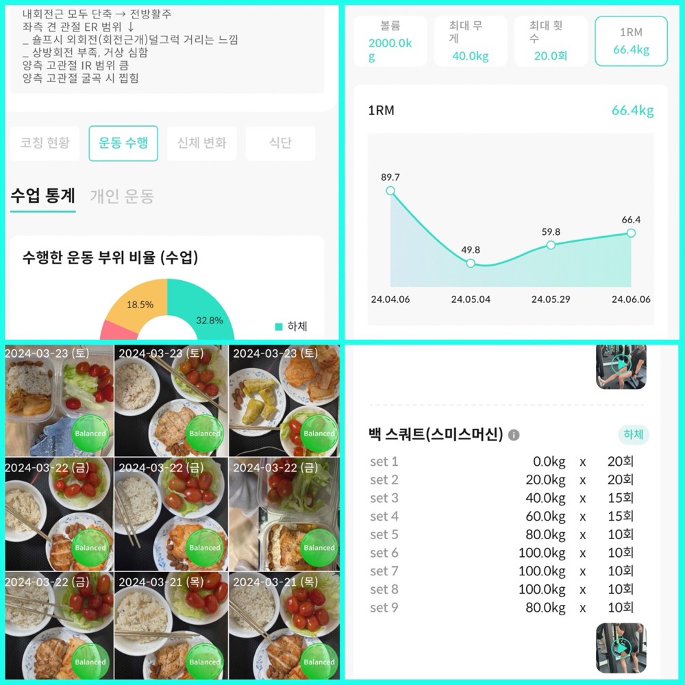 1.어플을 통해 운동관리,식단관리등 체계적인 관리 해주셔서 너무 좋았습니다. 어플을 통해 내가 운동하고 있는 종류와 무게에서의 진전됨을 볼 수있었습니다. 특히 식단 피드백은 건강한 다이어트 식단 유지하는데 큰 도움을 받았습니다.