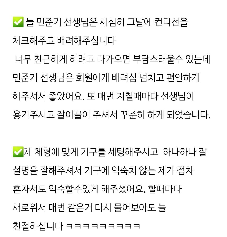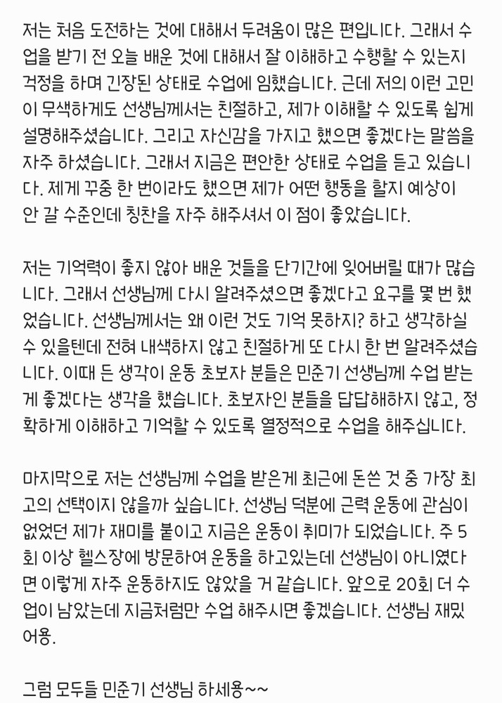 민준기 선생님 이 친절하게 아예기초부터 잘 가르쳐 주셔서 헬스에 대한 두려움 도 없어지고 운동도 처음부터 배울수 있어서 좋았습니다