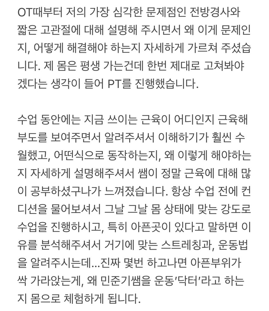 해외에 나갈 생각이라 pt다닐 생각이 없었는데 체험 OT 해주실때 너무 잘 가르쳐 주셔서 PT 다니기로 했습니다. 거북목이 심하고 무릎이 많이 안좋은데 그런부분을 잘 캐치해주신뒤 저에게 맞게 잘가르쳐주셔서 전보다 무릎 컨디션이 좋은 편입니다~