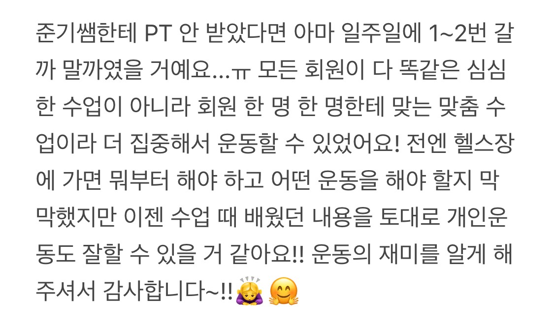 체계적인 계획(피티 전 항상 어떤 운동할 지 알려주심, 개인운동 루틴도 짜주심), 융통성있고 지속가능한 식단, 운동이 즐거워지고 운동 수행에 대한 욕심도 생기게 하는 ,, 준기쌤으로 오세요