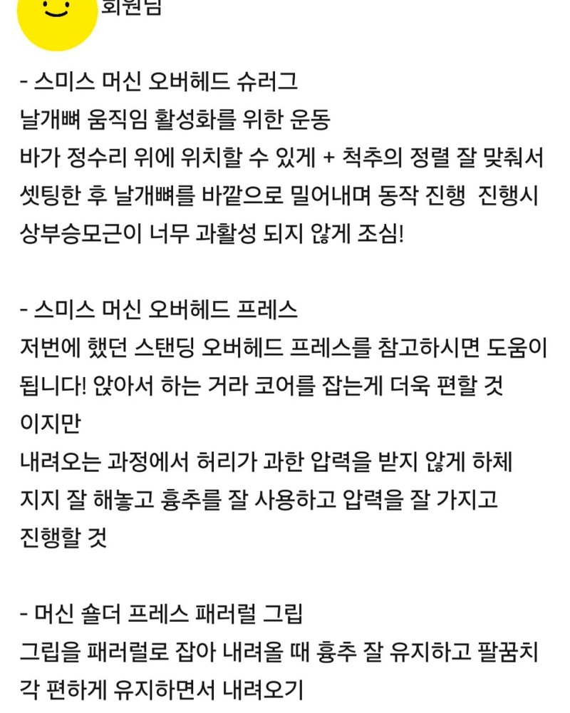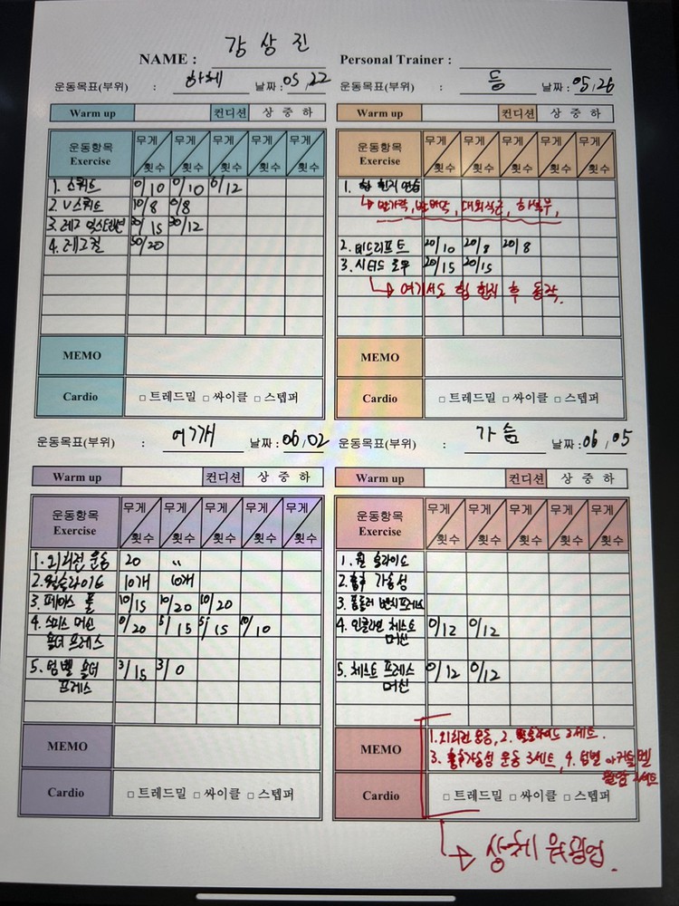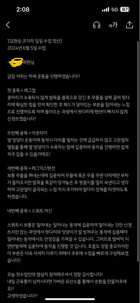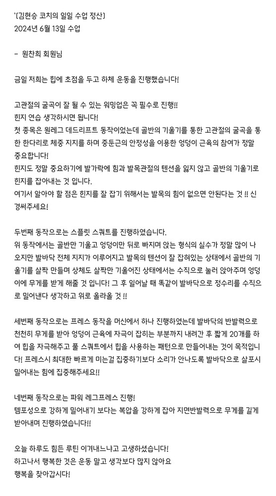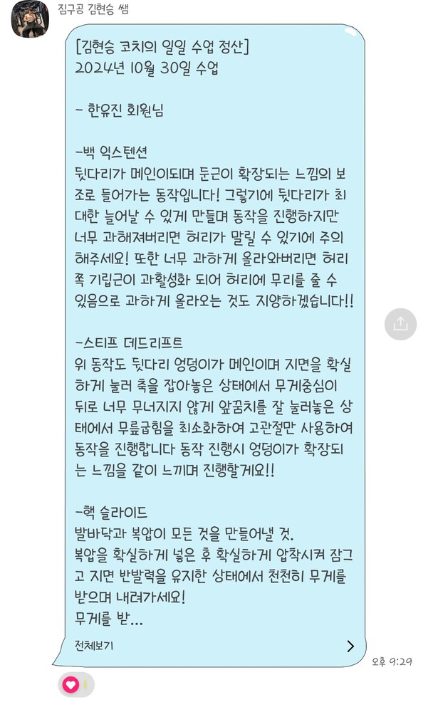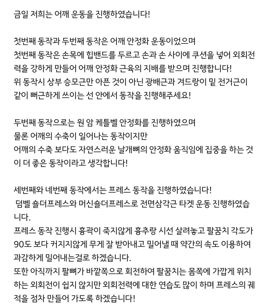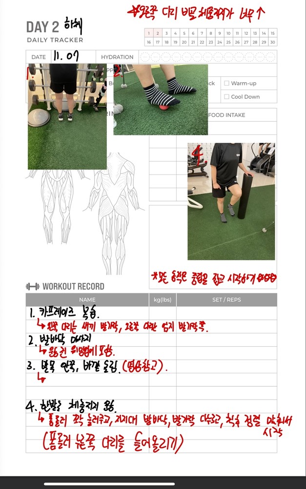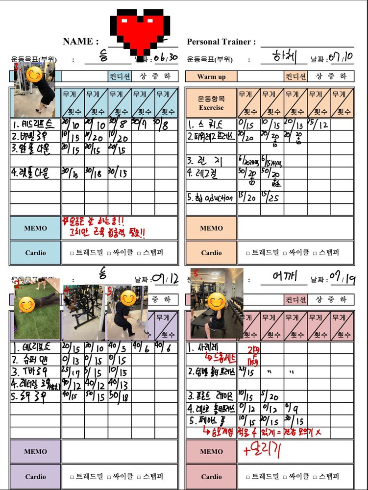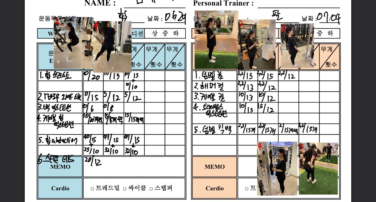 우선 가장 좋은 점은 매번 수업때마다 운동사진을 찍어주시고 메모를 해주셔서 수업이 없는 날에도 개인운동을 나와 기록을 보면서 운동할 수 있었어요!!
