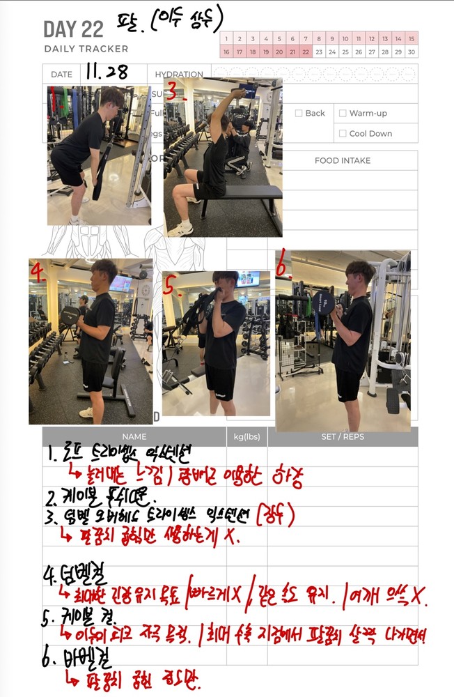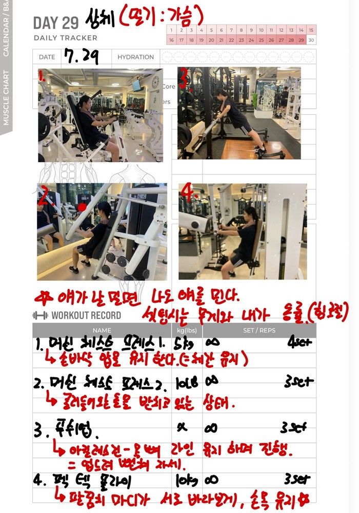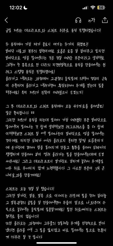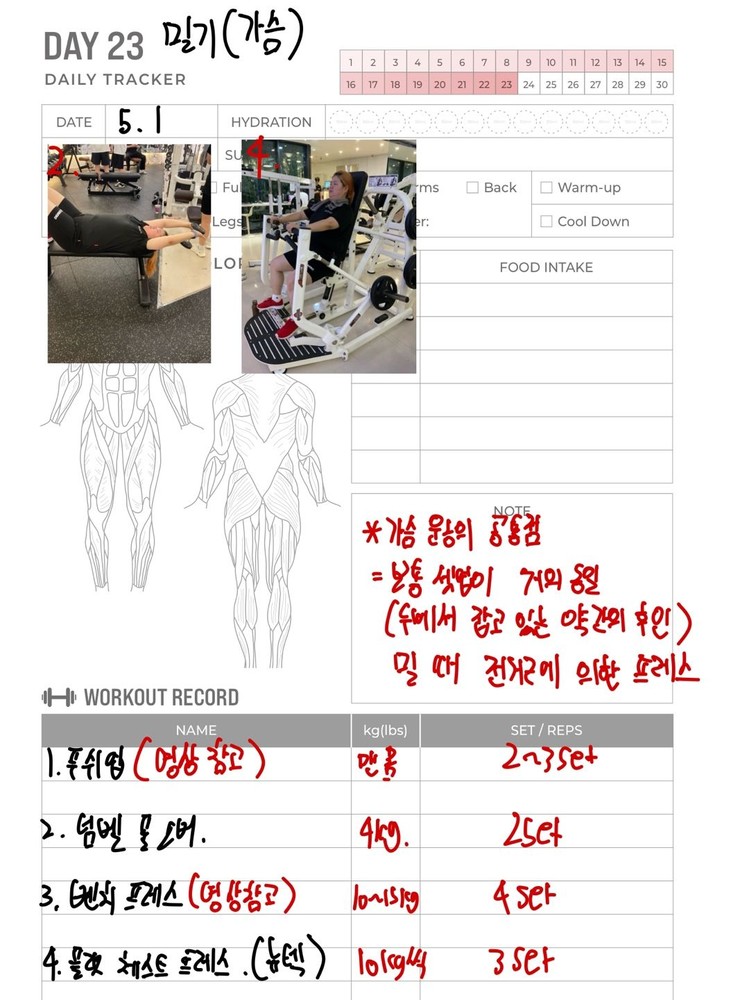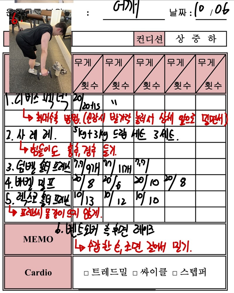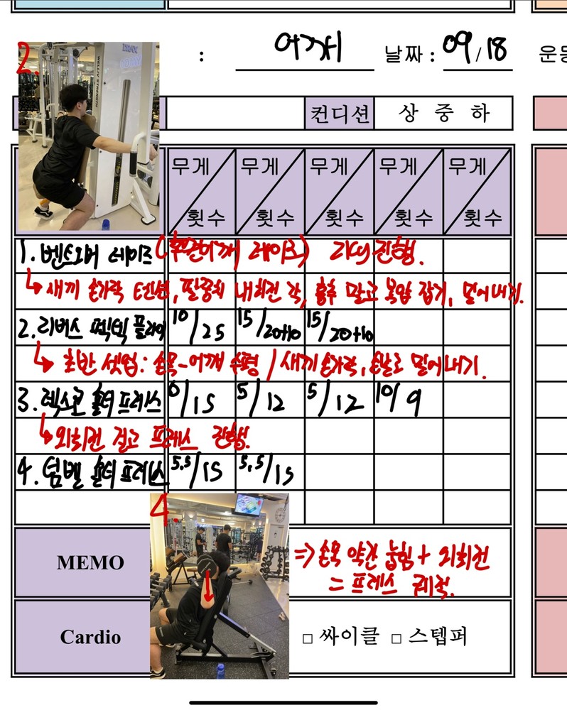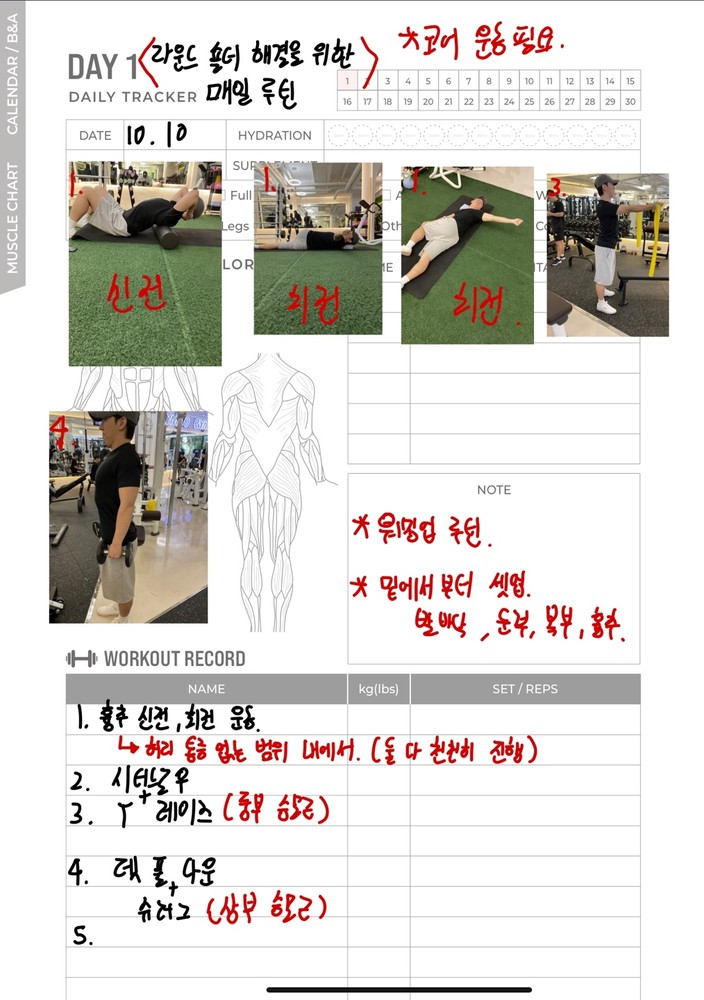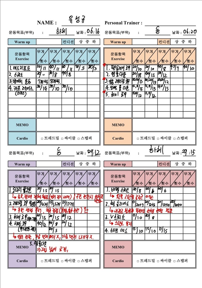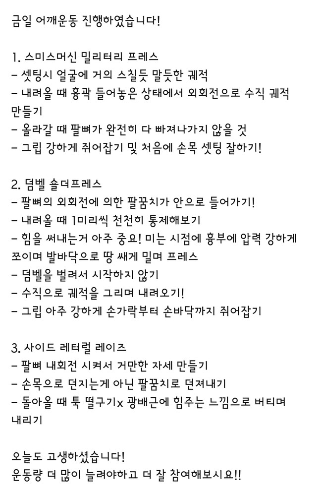 우선 가장 좋은 점은 매번 수업때마다 운동사진을 찍어주시고 메모를 해주셔서 수업이 없는 날에도 개인운동을 나와 기록을 보면서 운동할 수 있었어요!!