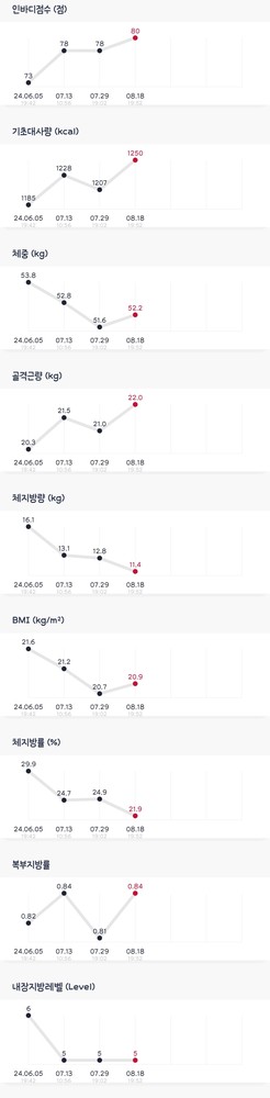 헬스장 그 특유의 어려워보이는 기구들에 괜히 거부감이 있던 일반여자사람입니다. 2년동안 러닝과 수영으로 혼자 7키로 정도 빼고, 정체기가 와서 운태기극복&득근을 위해 리나쌤과 6월부터 운동을 시작했어요. 운동하면서 근육쓰임에 대해서도 알게되고, 내 몸에 대한 관심과 애정도 더 갖게되었어요. 첨부한 인바디 수치처럼 두달간 꽤 많은 변화가 있어서 힘들어도 즐거운 마음으로 하게되는 것 같아요! 건강한 체중감량과 균형잡힌 몸매, 체형개선을 중요시하시는 분께 추천드립니다👍🏻 🤍🤍운동은 갈때, 할때 힘들지만 집에가는길엔 뿌듯하고 행복합니다. 오셔서 운동하세여!!ㅎㅎ