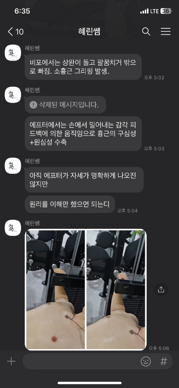 저는 단순히 무겁게 운동하면 근육이 커지는줄 알았는데 선생님께서 올바른자세와 정렬을 유지하면 보다 무겁지 않은 중량으로도 근육에 충분히 자극을주고 관절,인대등에 무리가 가지않게 근성장을 할 수 있다고 말씀해주셔서 앞으로 자세와 자극.정렬을 신경쓰며 운동하려고 합니다.